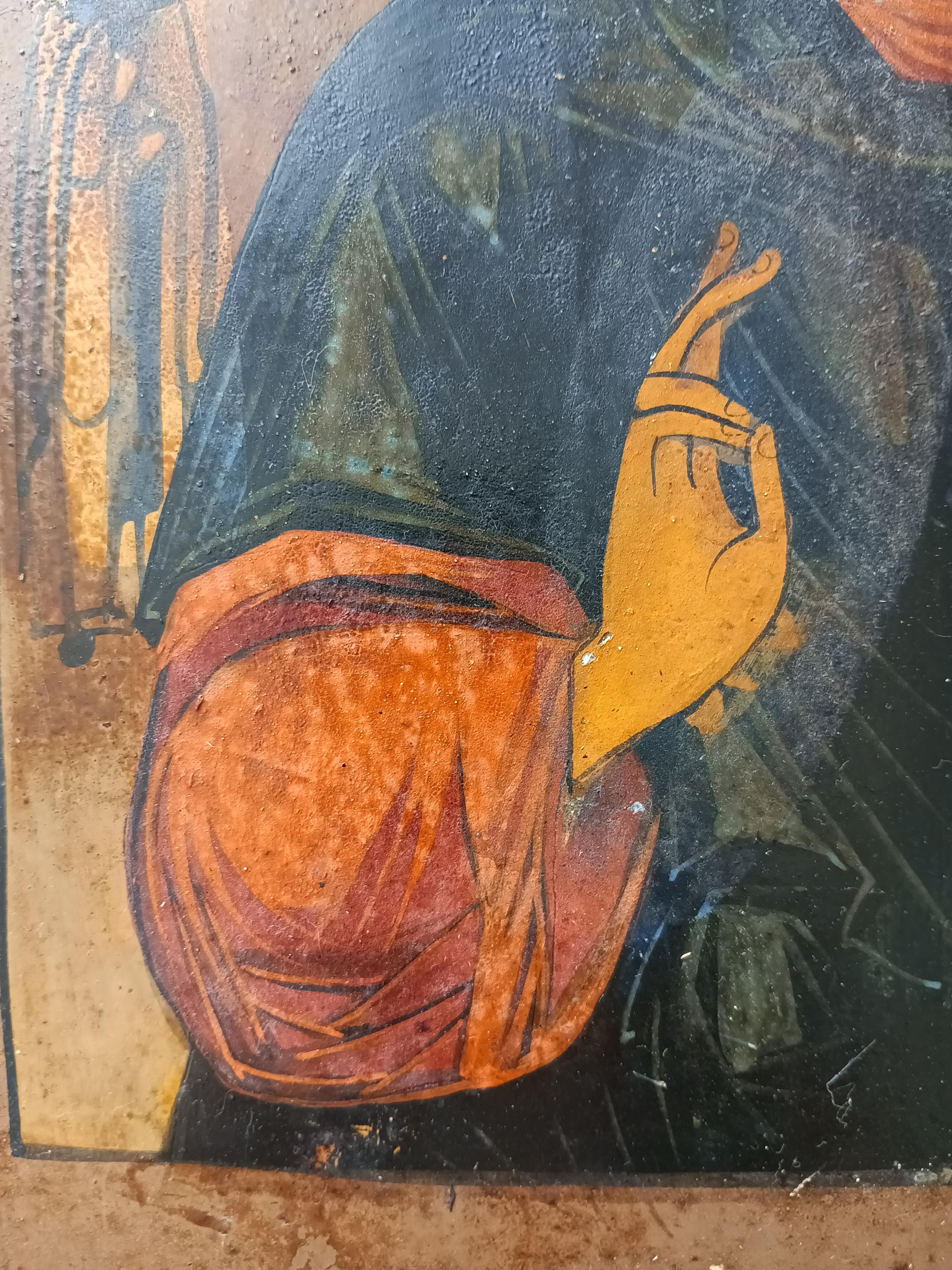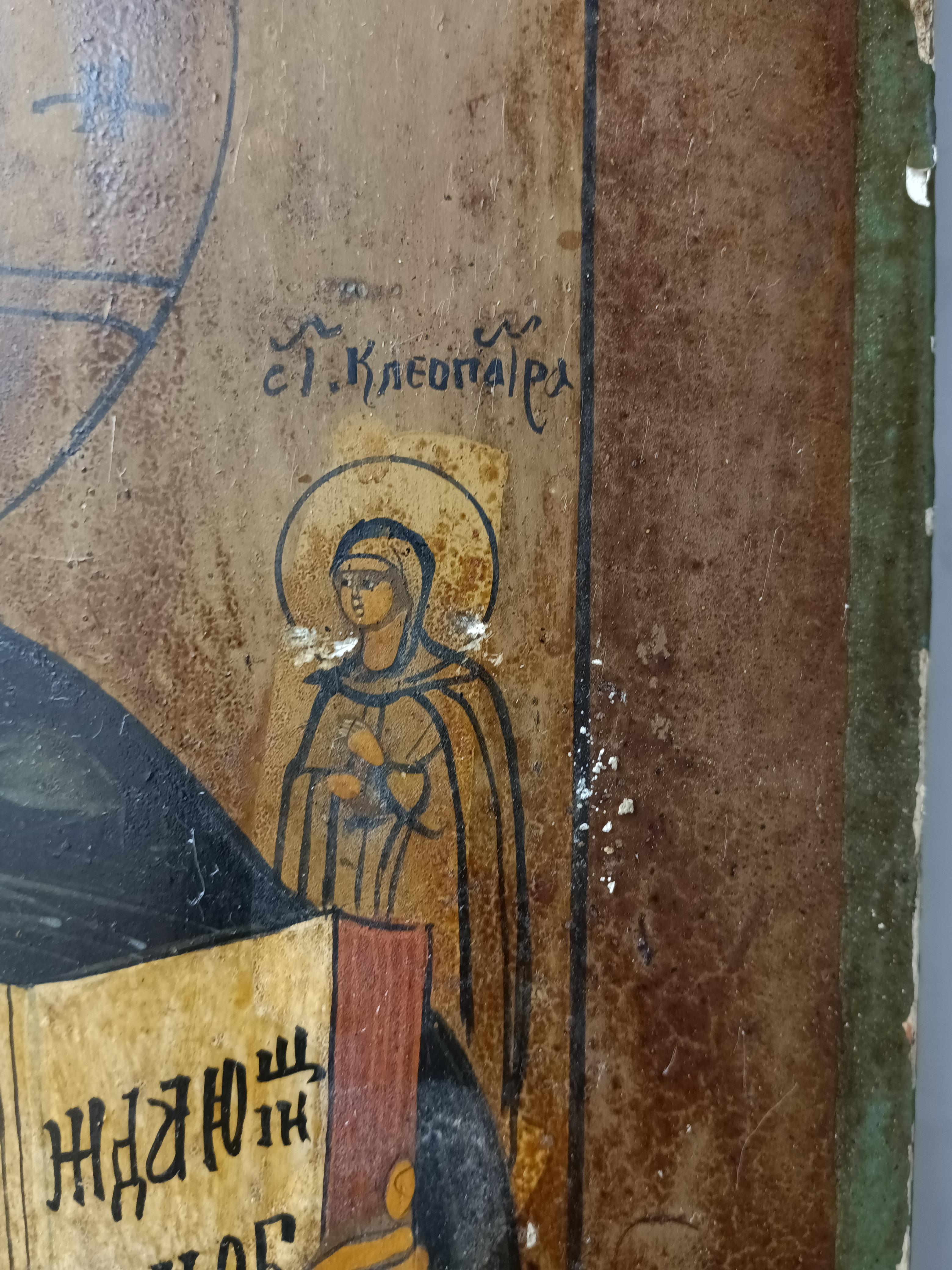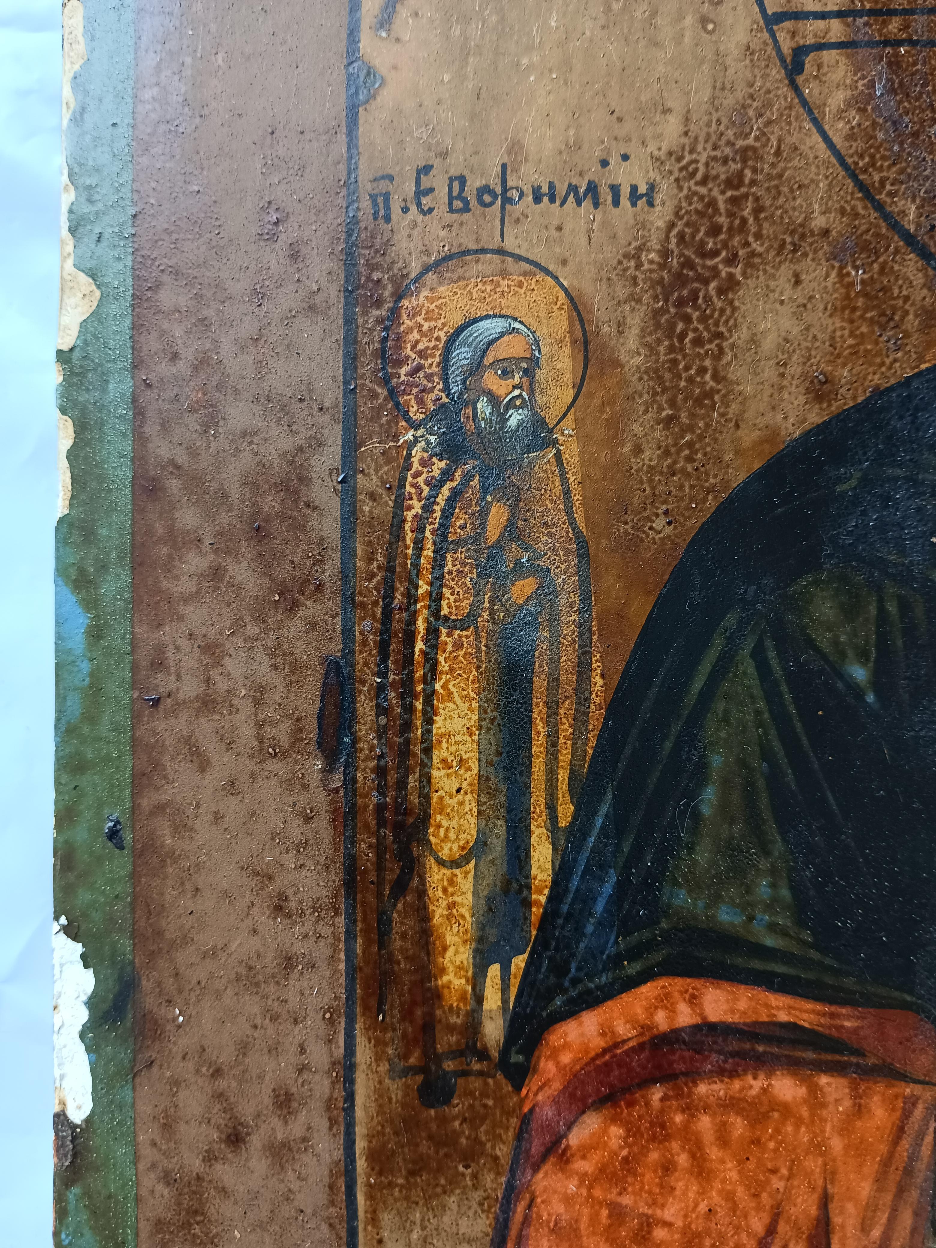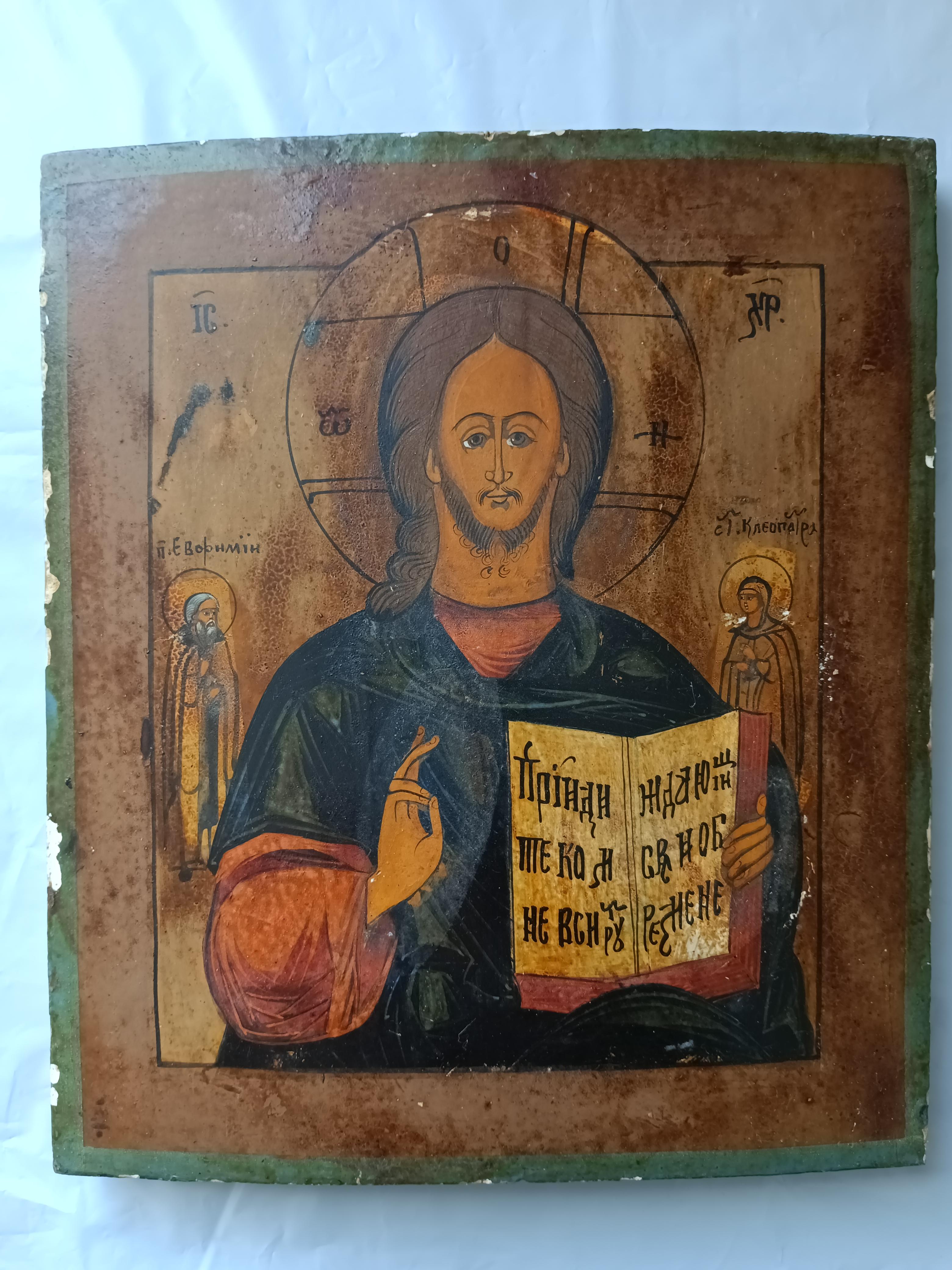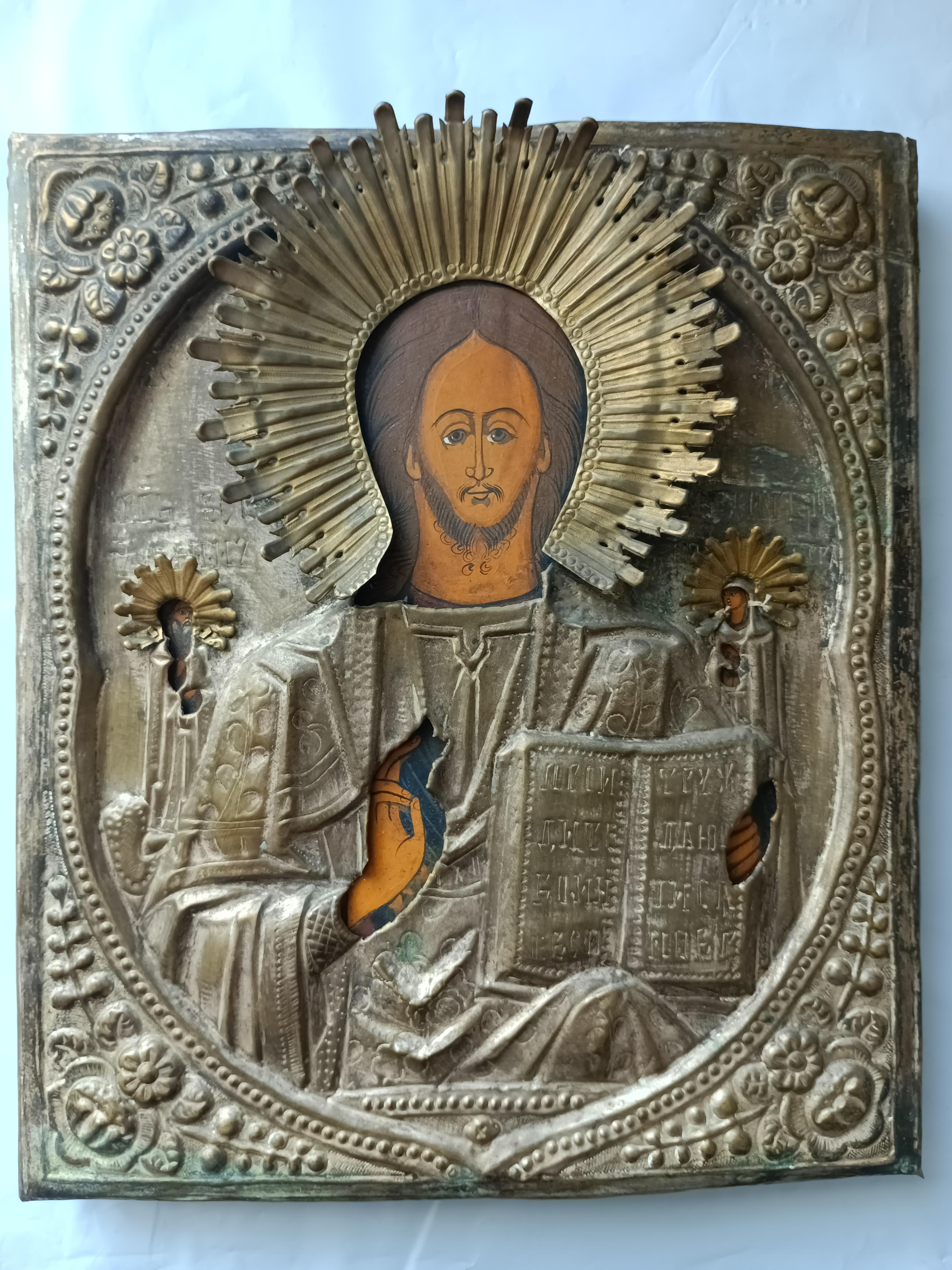 Икона "Господь Вседержитель" с предстоящими преп. Ефимием и вм. Клеопатрой 31*27 см. Конец 19 века. Оклад крепкий и тяжелый. Вес иконы с окладом 1100 гр.