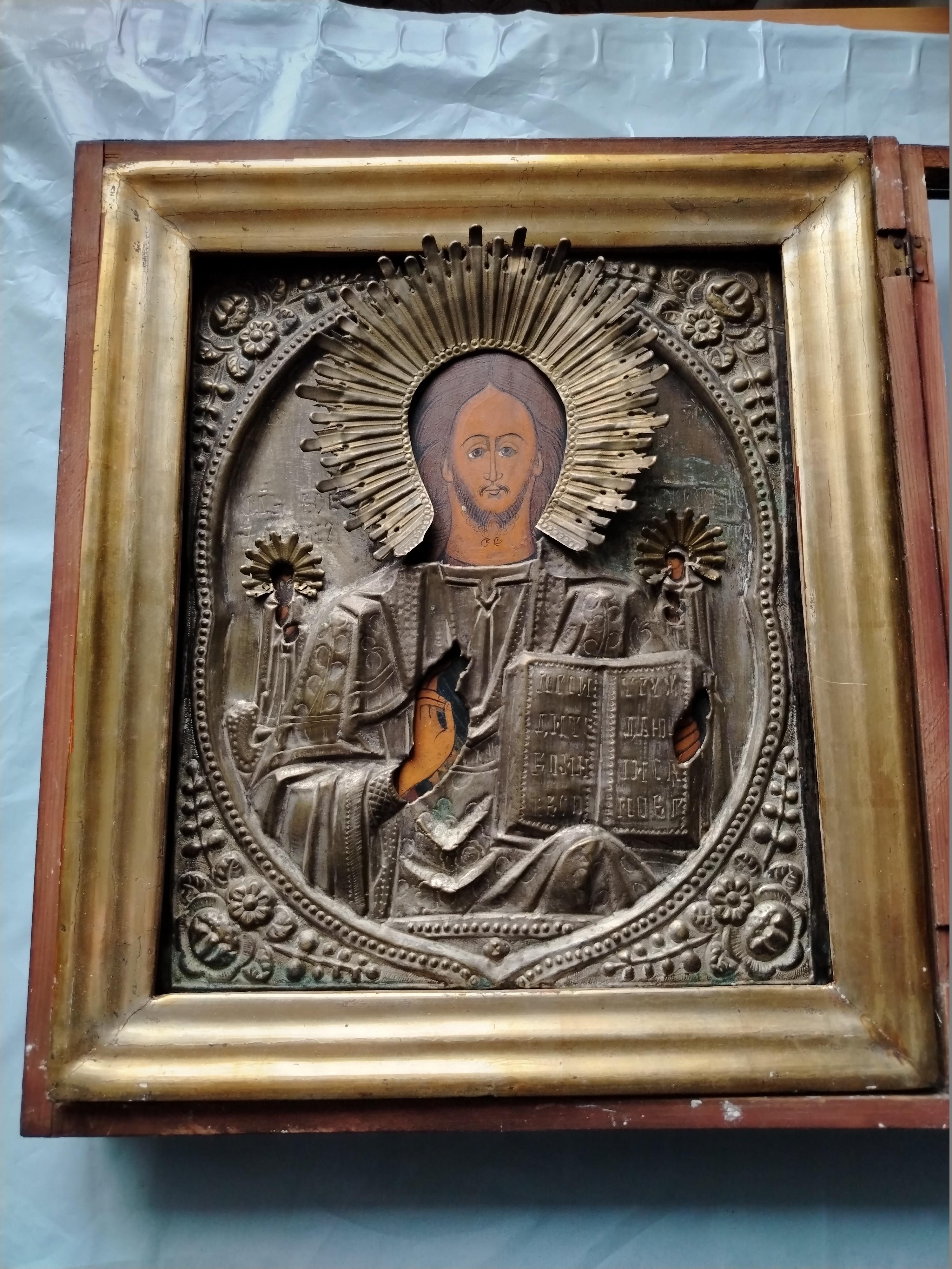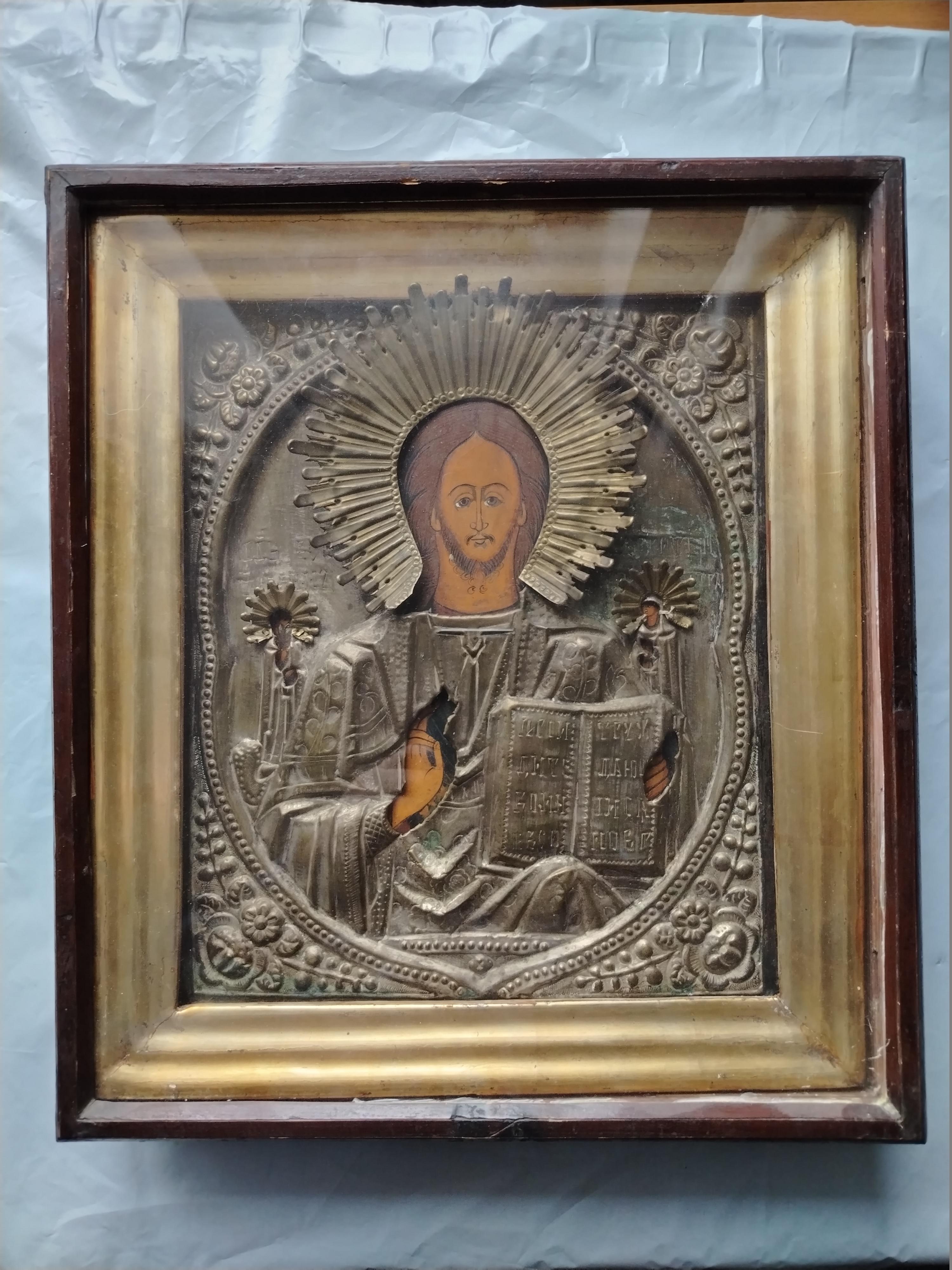 Икона "Господь Вседержитель" с предстоящими преп. Ефимием и вм. Клеопатрой 31*27 см. Конец 19 века. Оклад крепкий и тяжелый. Вес иконы с окладом 1100 гр. В старом киоте, рамка с родным золочением.