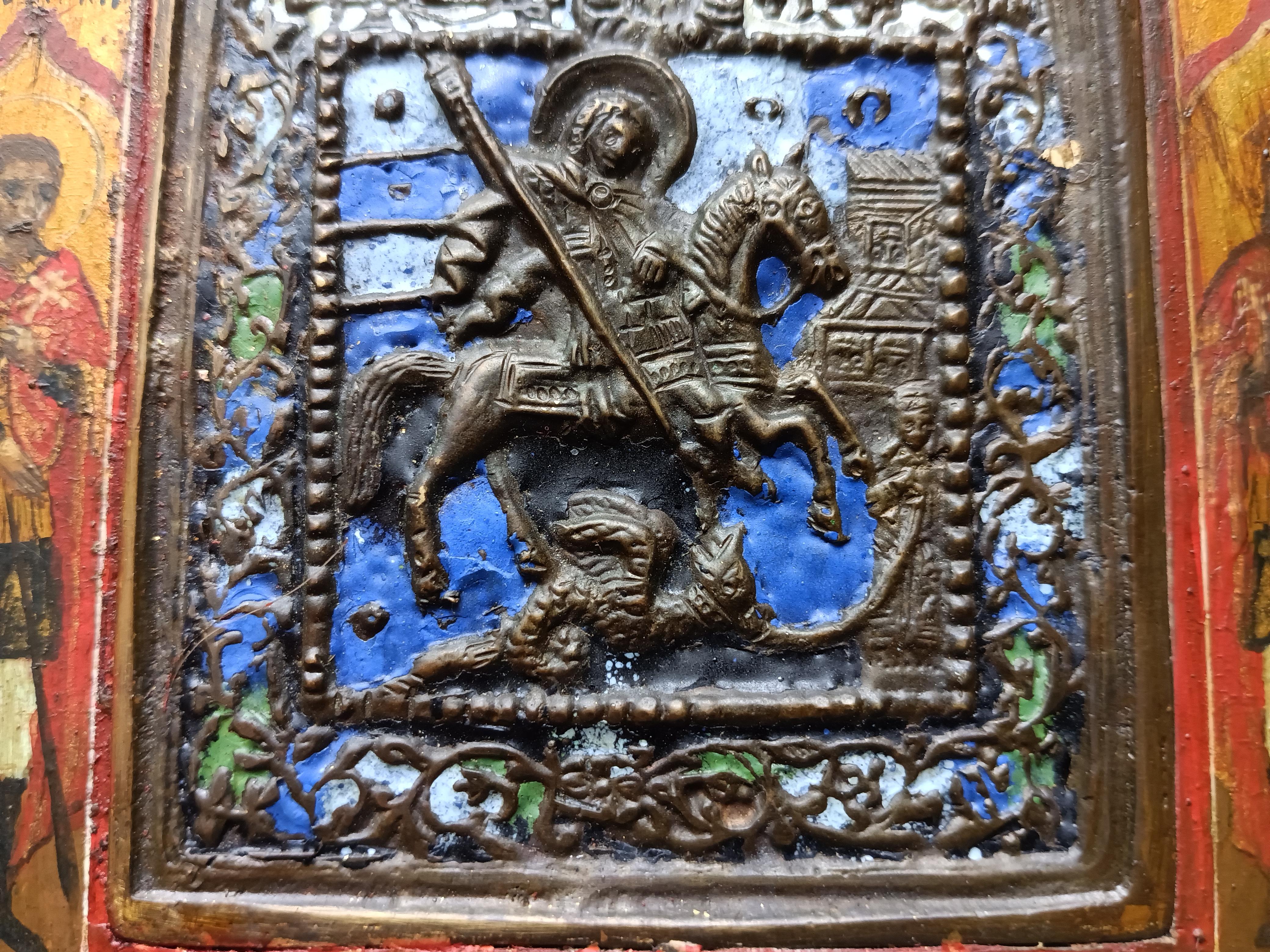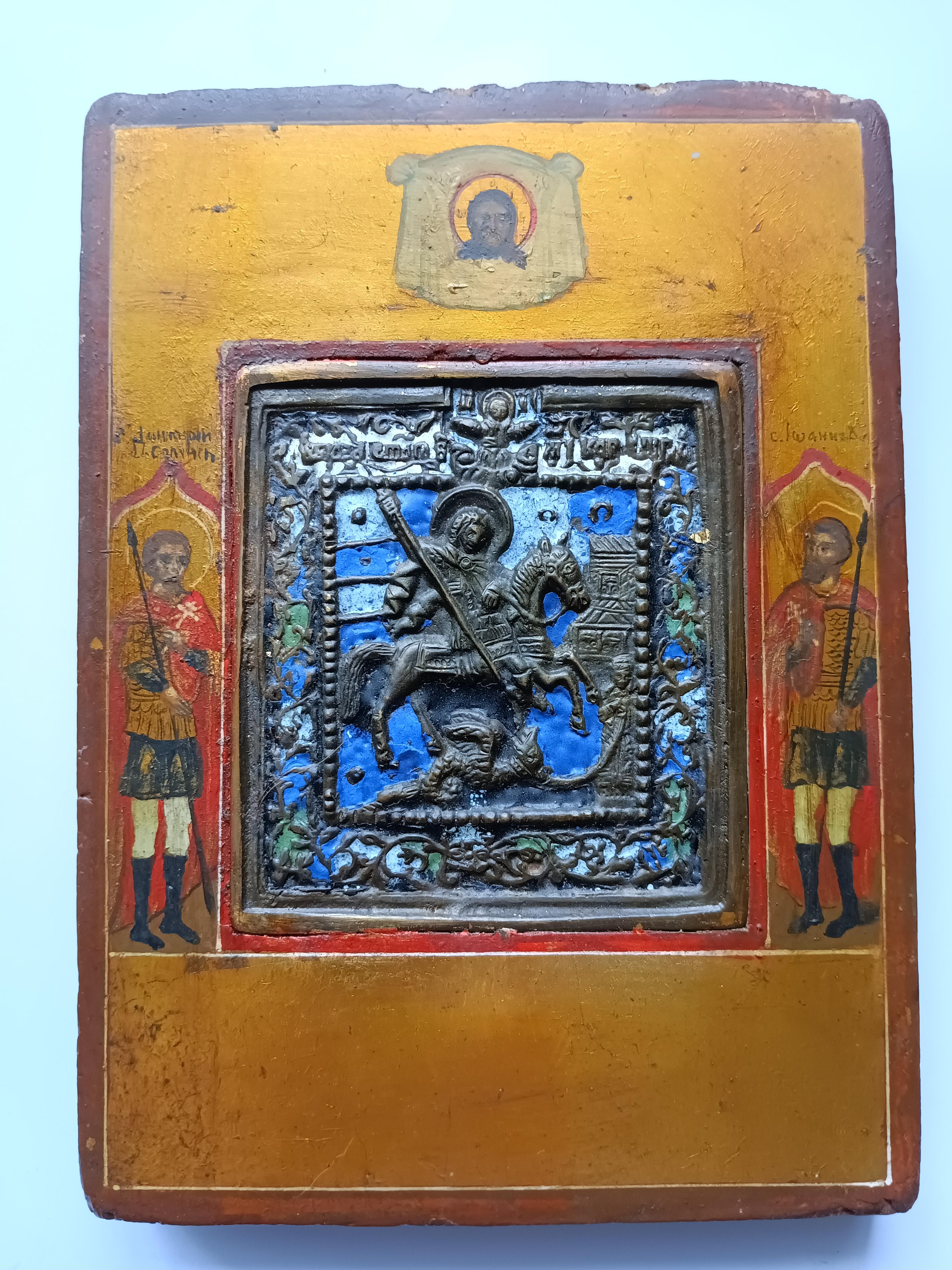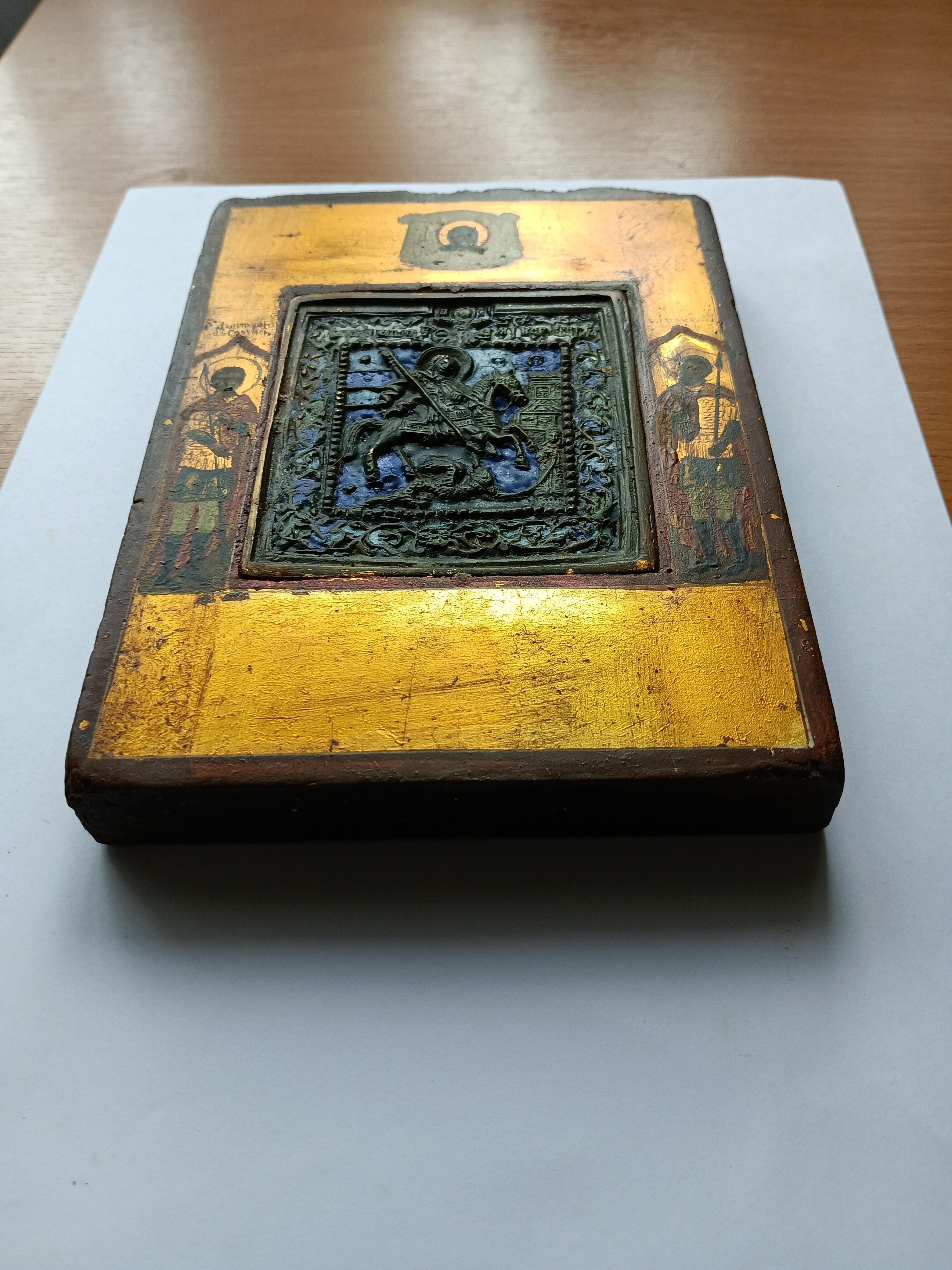 Икона литая "Георгий победоносец" с эмалями Приписные: Дмитрий Солунский и Иоанн Воин Размер доски 17*12,5* 2 см Размер иконы 8,5*7,5 см