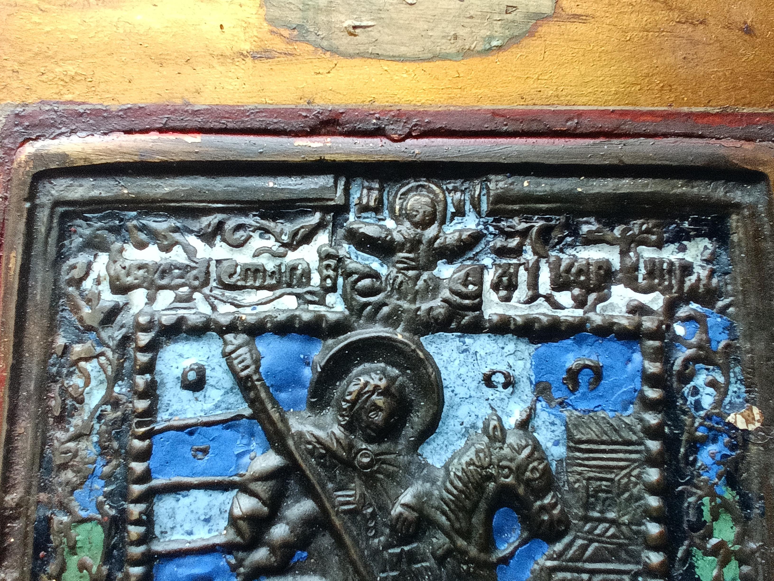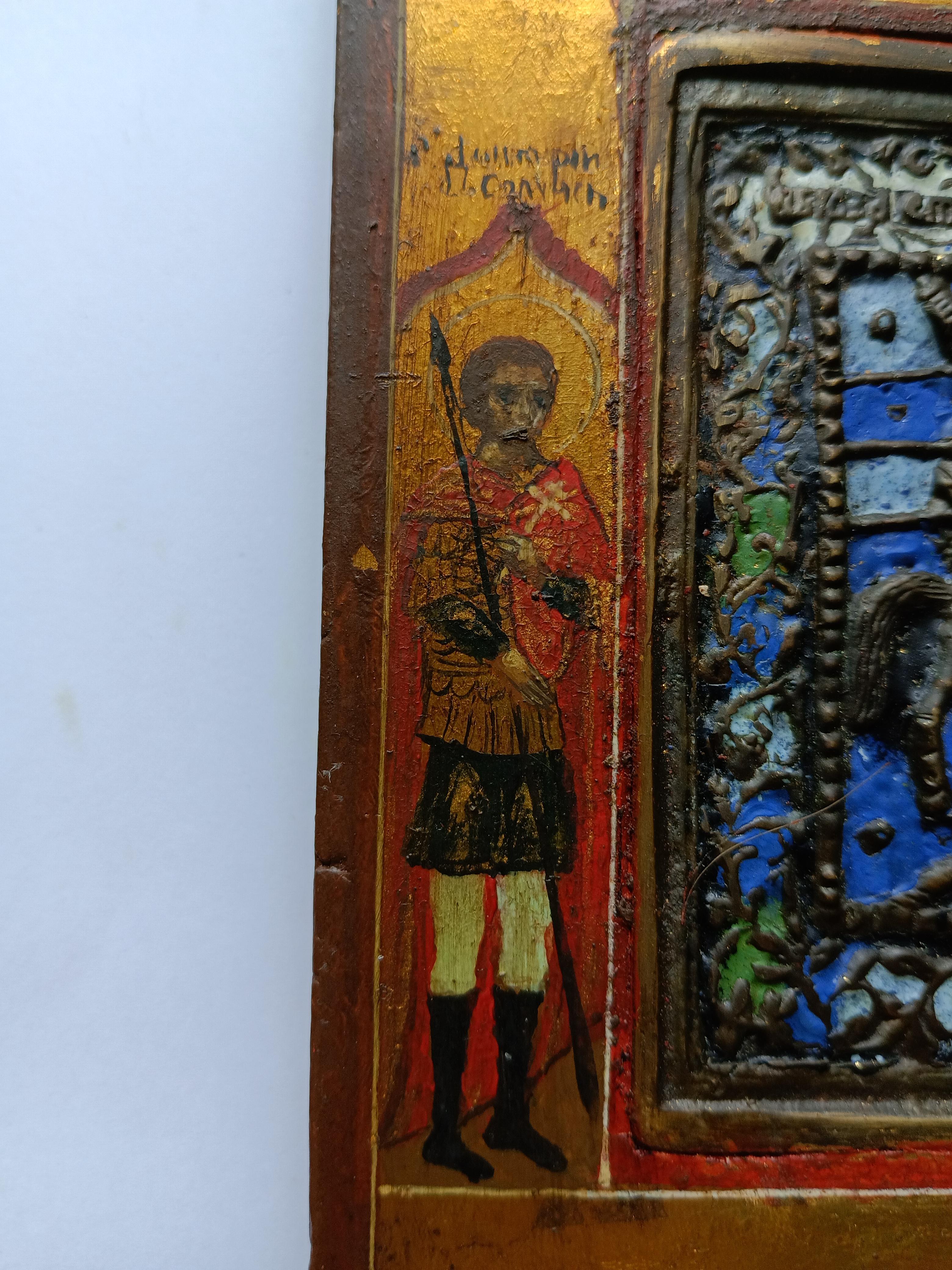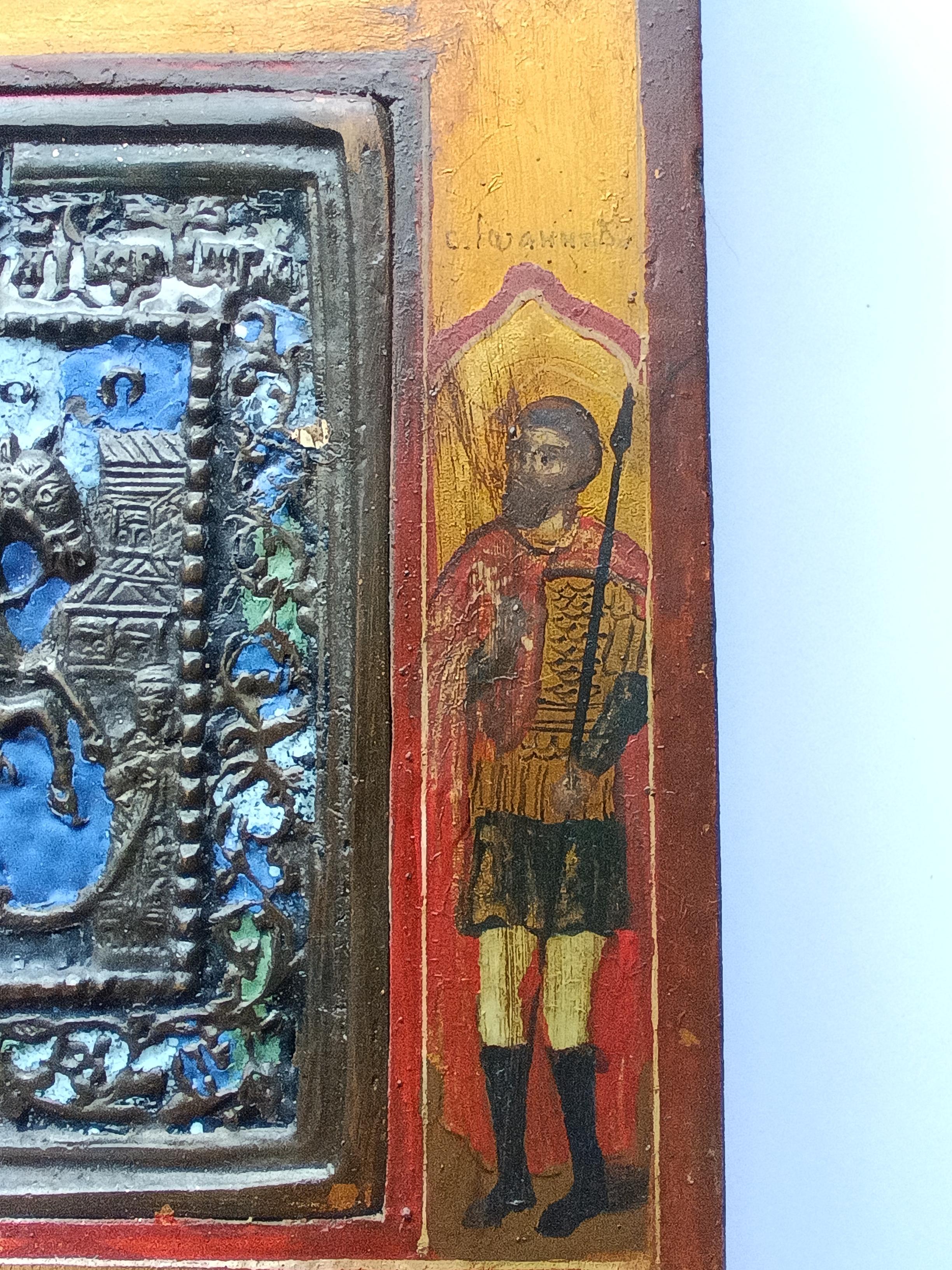 Икона литая "Георгий победоносец" с эмалями Приписные: Дмитрий Солунский и Иоанн Воин Размер доски 17*12,5* 2 см Размер иконы 8,5*7,5 см