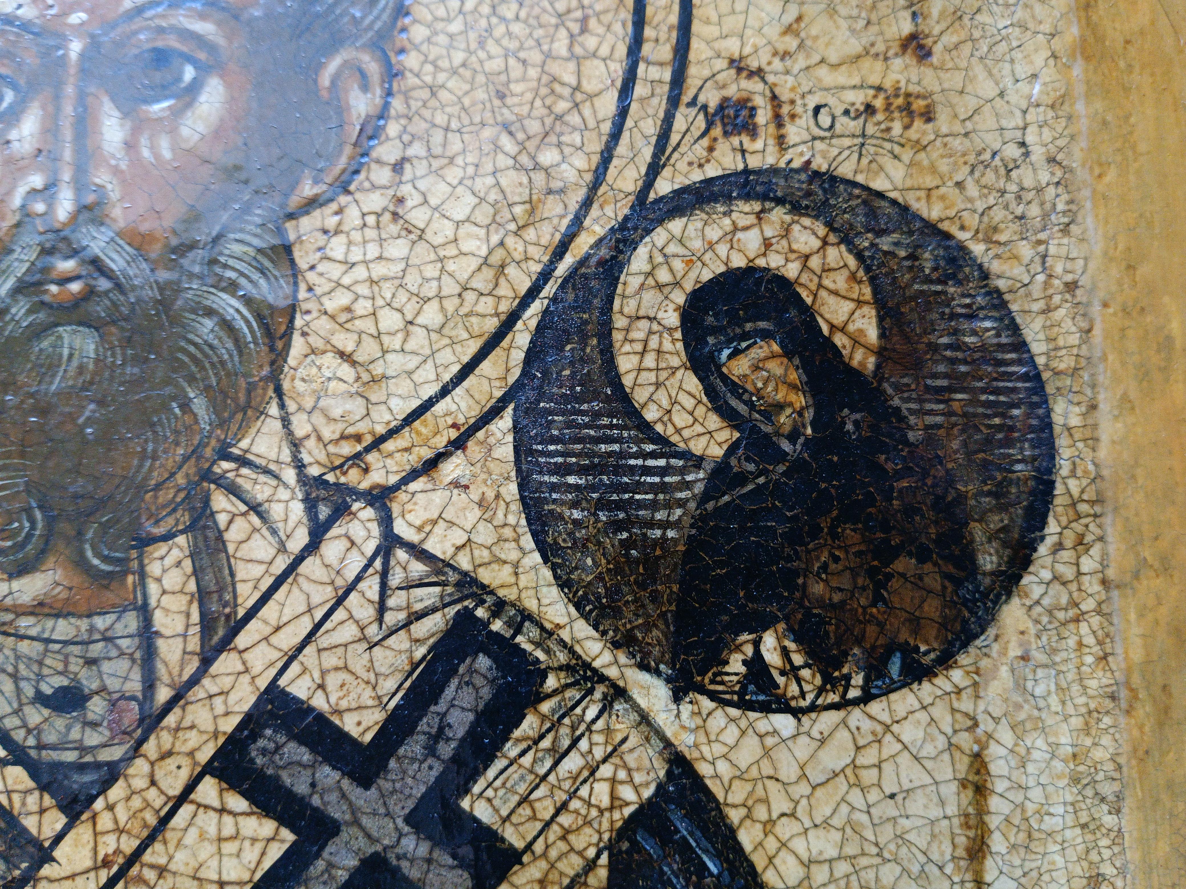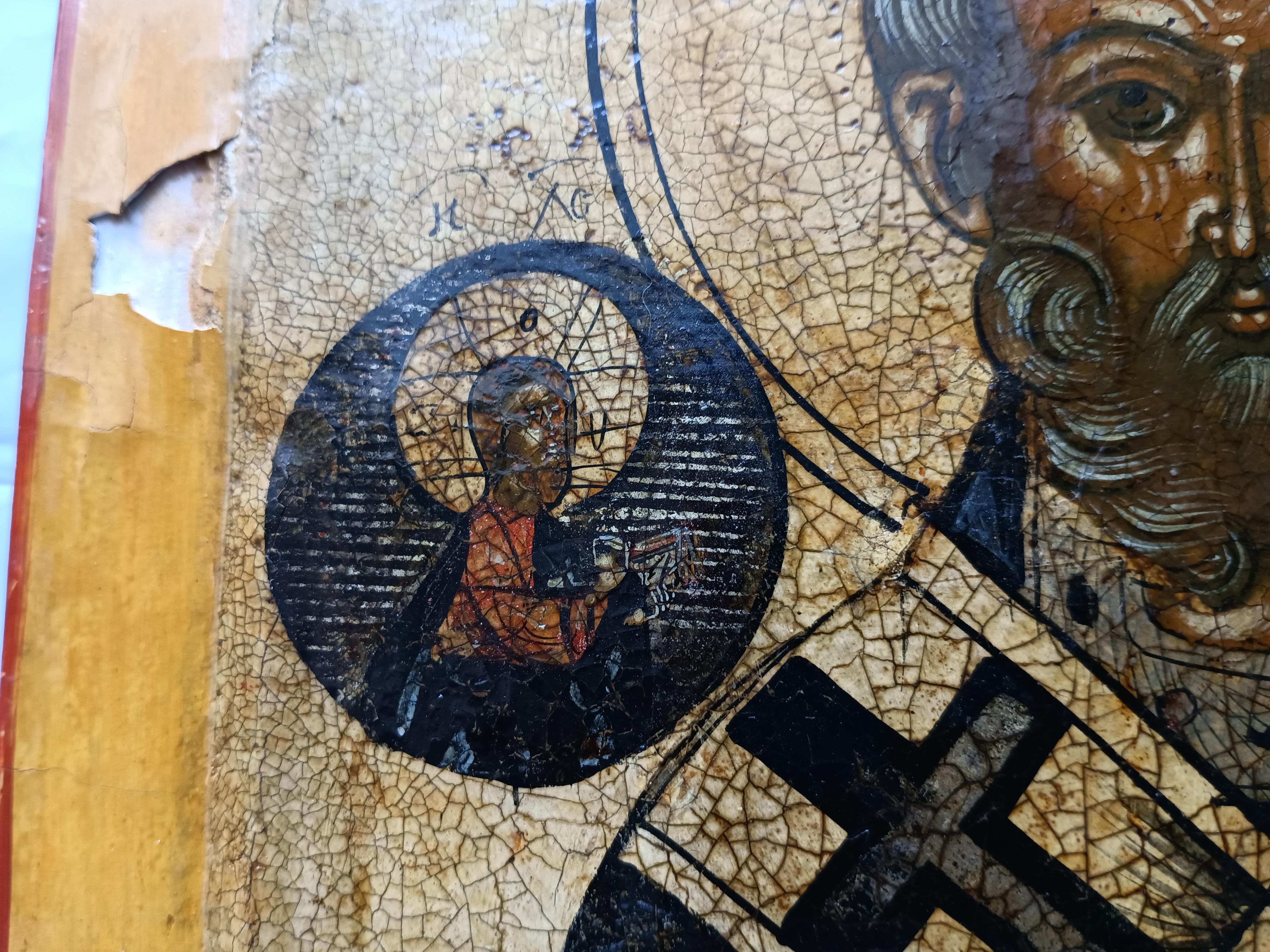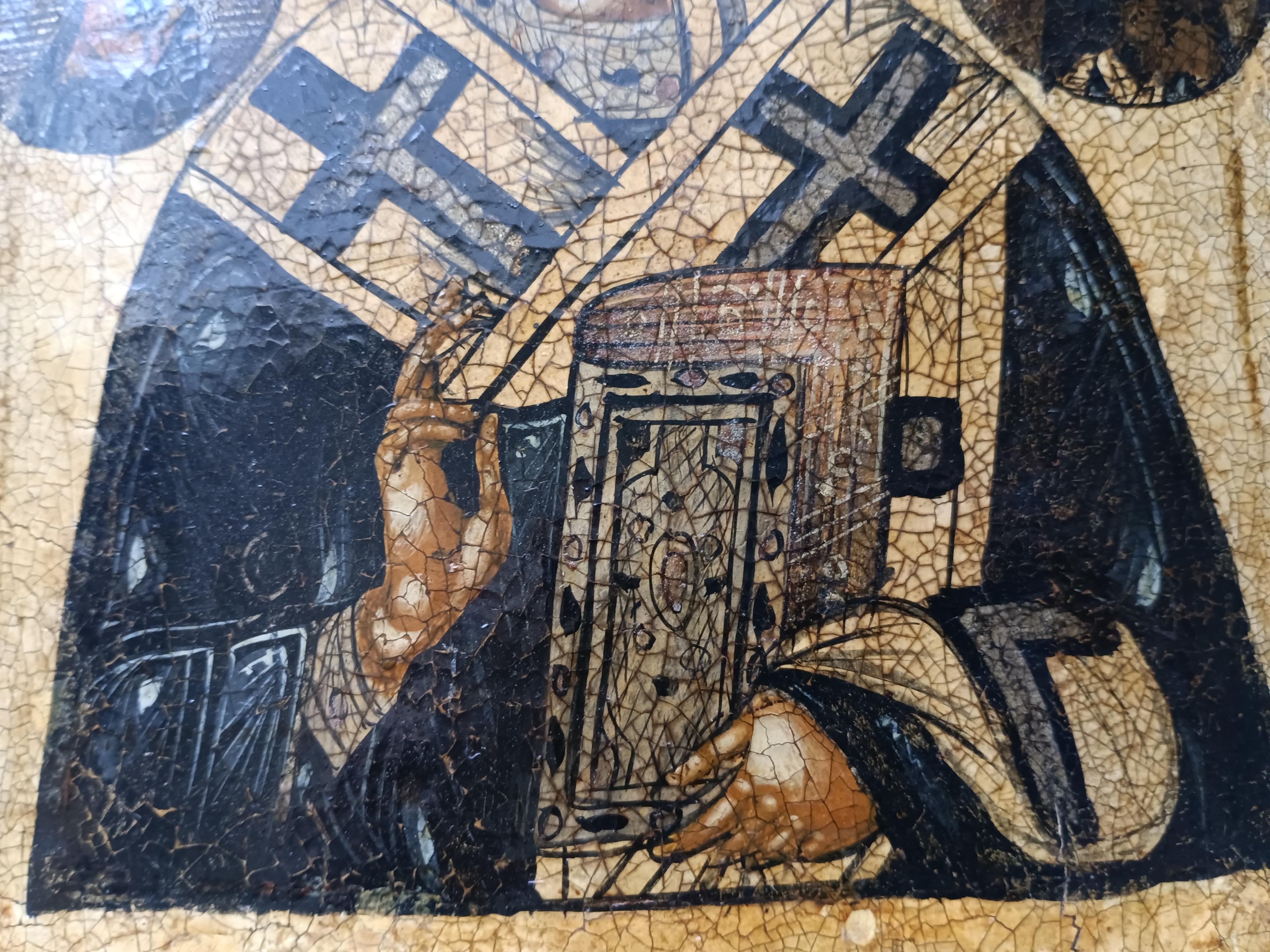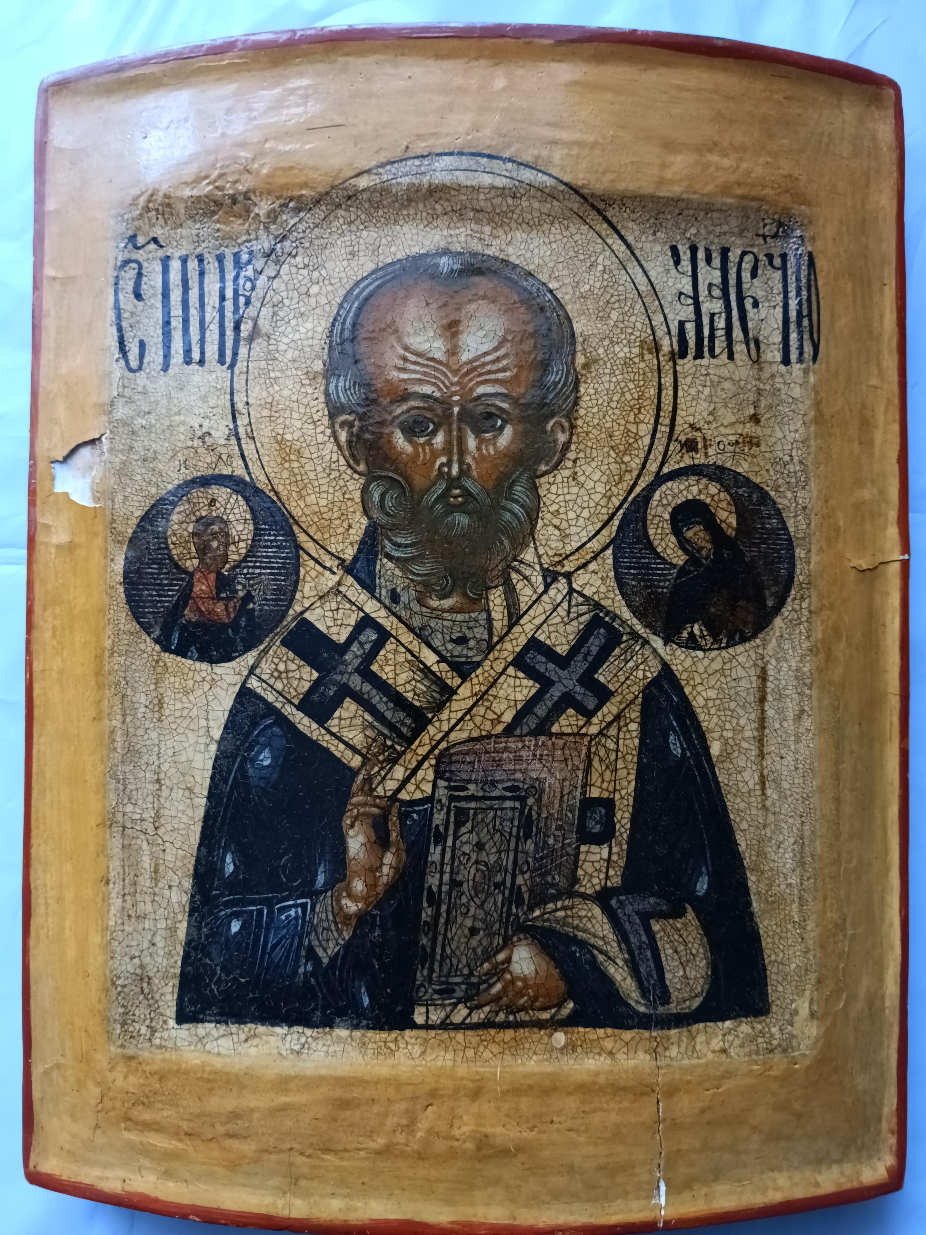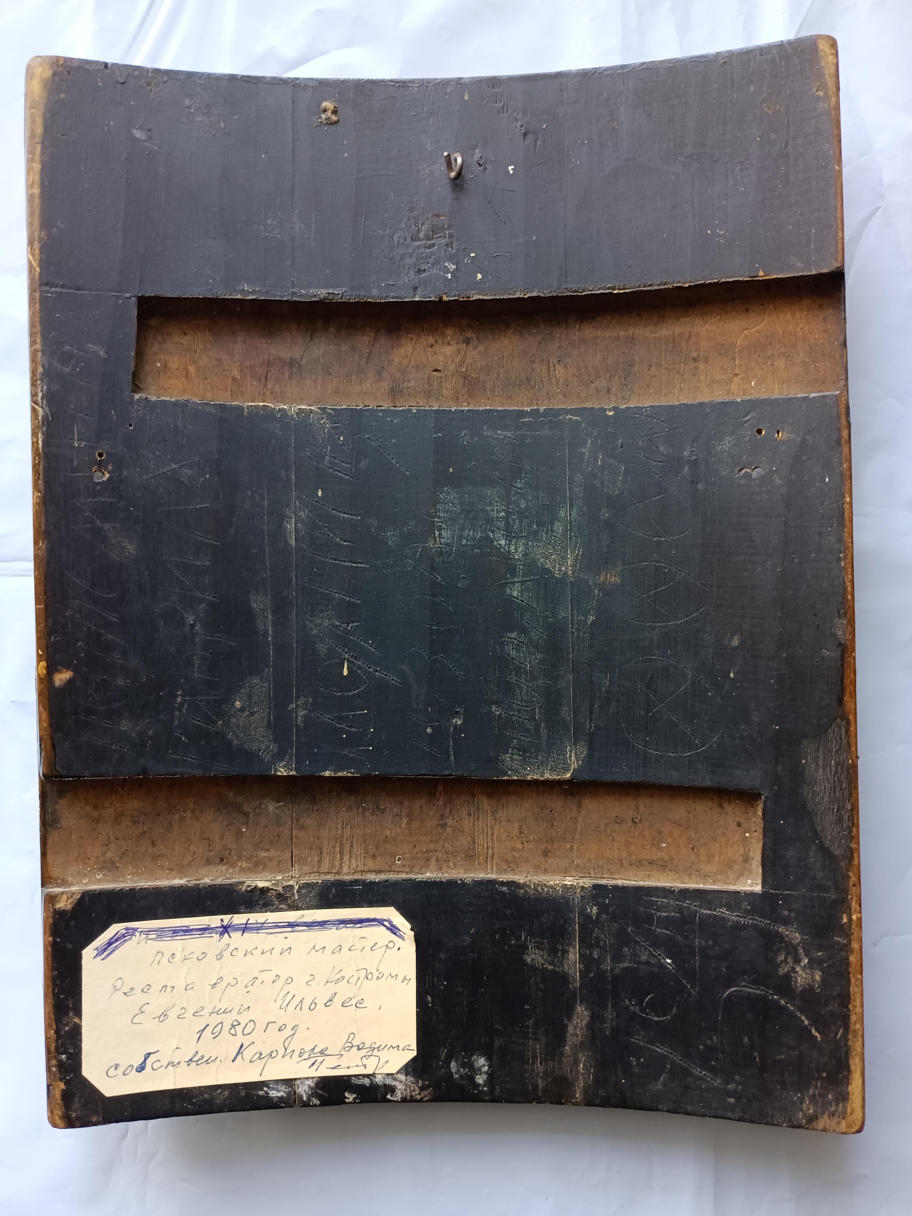 Икона "Николай Чудотворец" 31*26 см Судя по табличке на задней стороне, икона была отреставрирована в 1980 г. костромским реставратором Евгением Ильвесом. Ильвес Евгений Вениаминович, художник-реставратор товарищества "Костромареставрация", Заслуженный работник культуры Российской Федерации. Евгений Вениаминович входил в группу реставраторов, которые восстанавливали фрески Гурия Никитина в Троицком соборе Ипатьевского монастыря, росписи храма Воскресения-на-Дебре в Костроме, Владимирского и Никольского соборов в Нерехте, церкви Николая Чудотворца в с. Николо-Бережки и многих других.