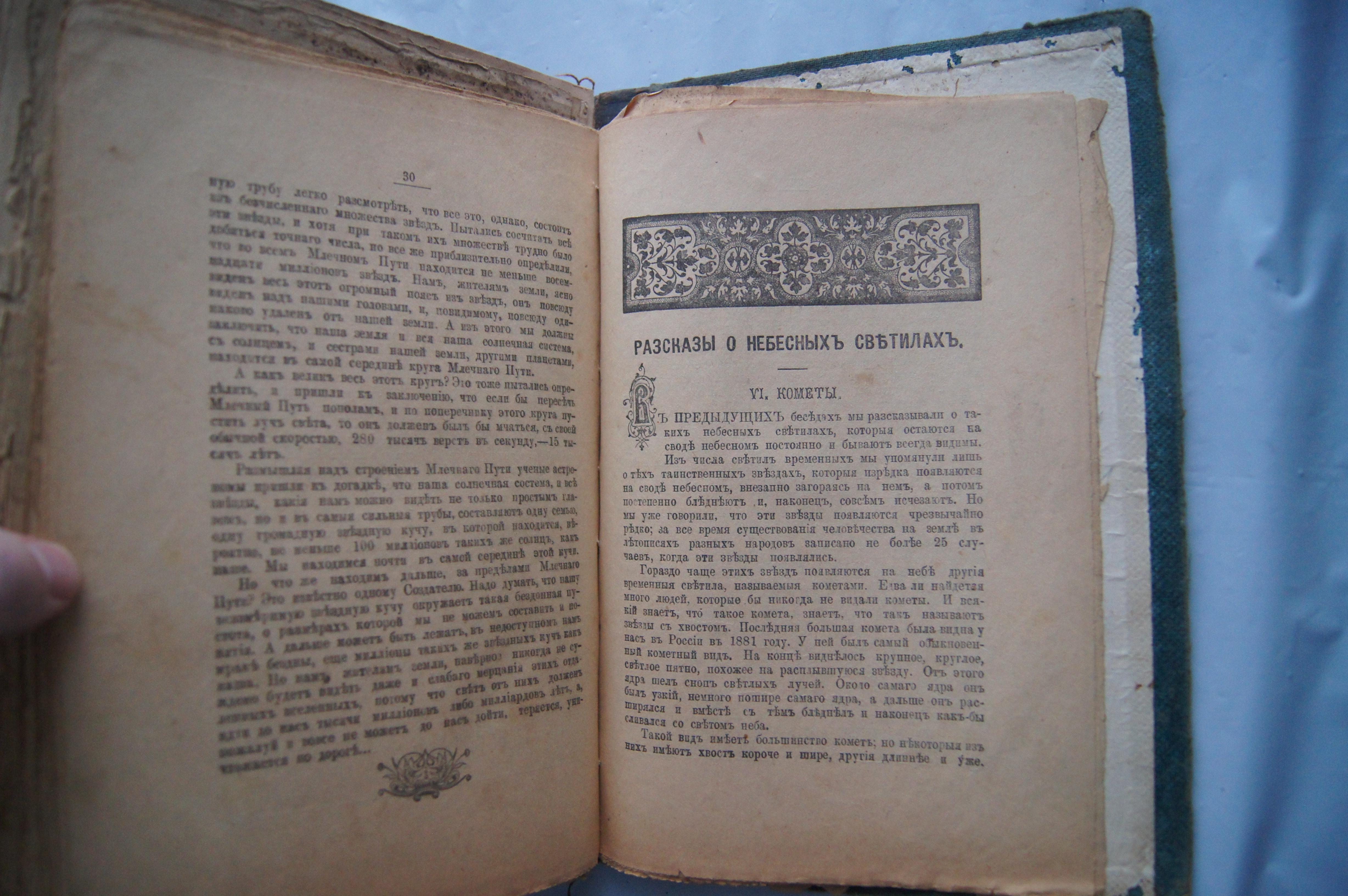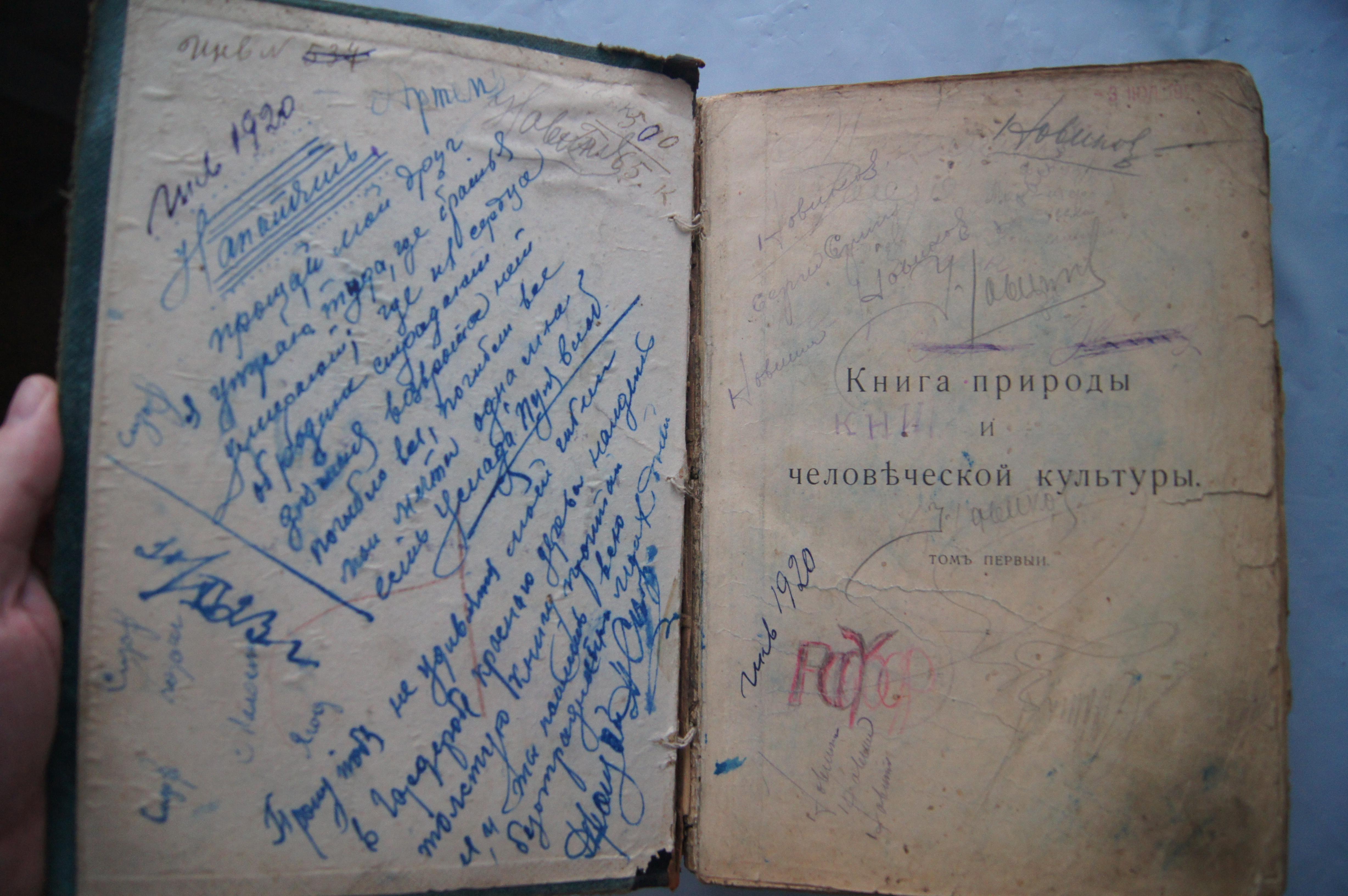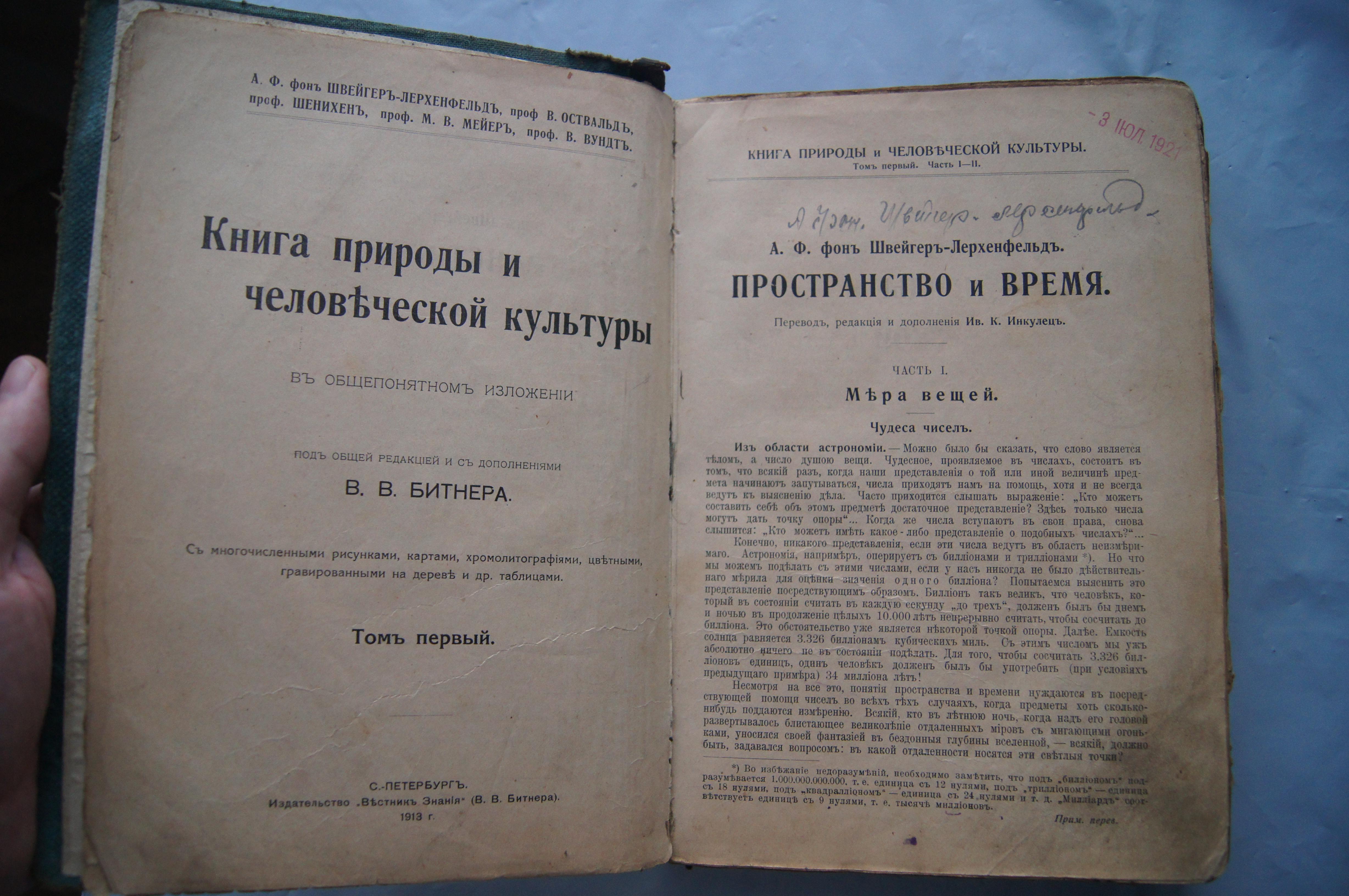 Книга природы и человеческой культуры 1913 г. Со вставкой "Рассказы о небесных светилах." Размер 25*17*4 см. На развороте подпись от человека, уезжающего на войну. На 5 странице подпись карандашом автора книги над его ФИО.