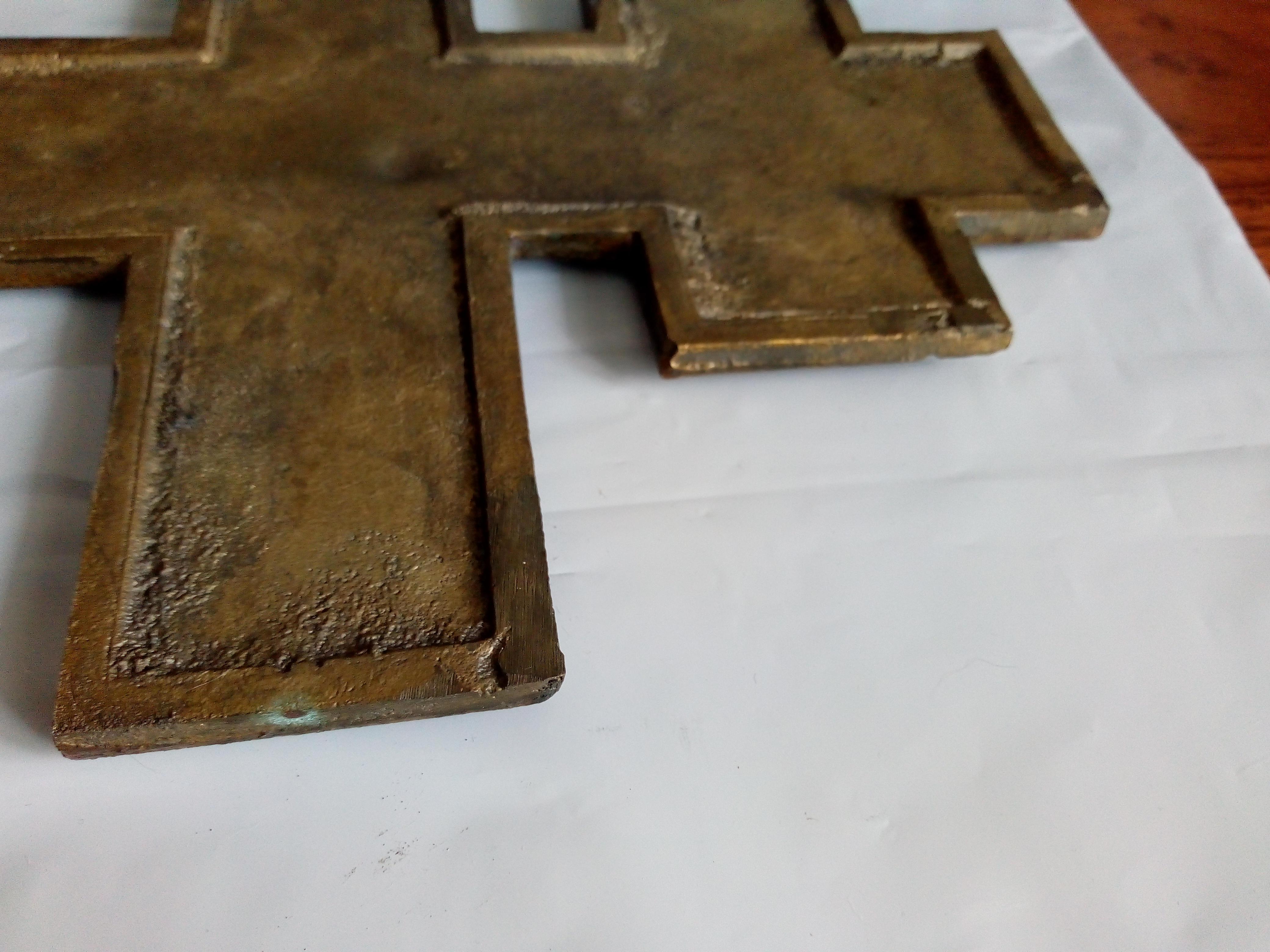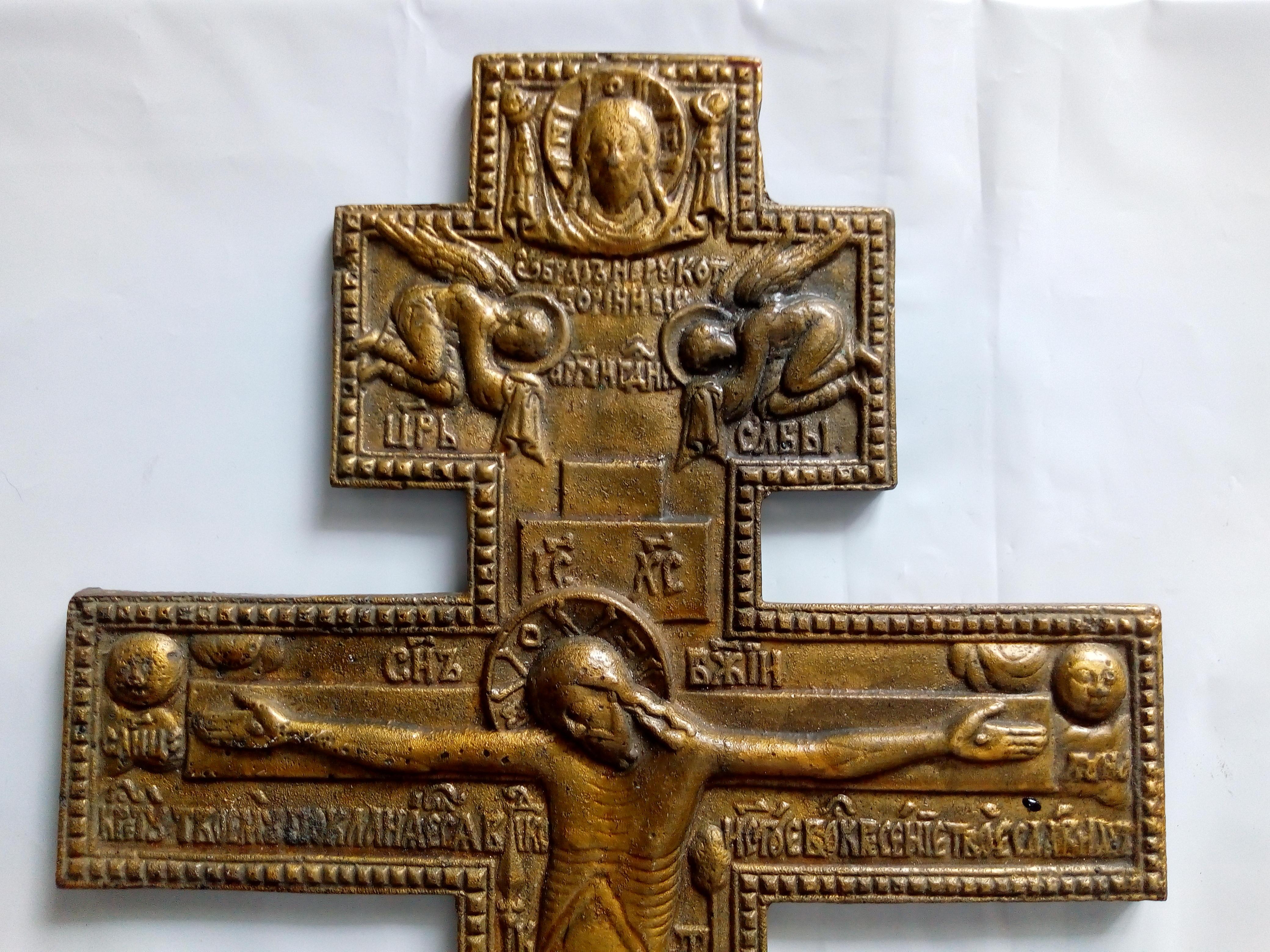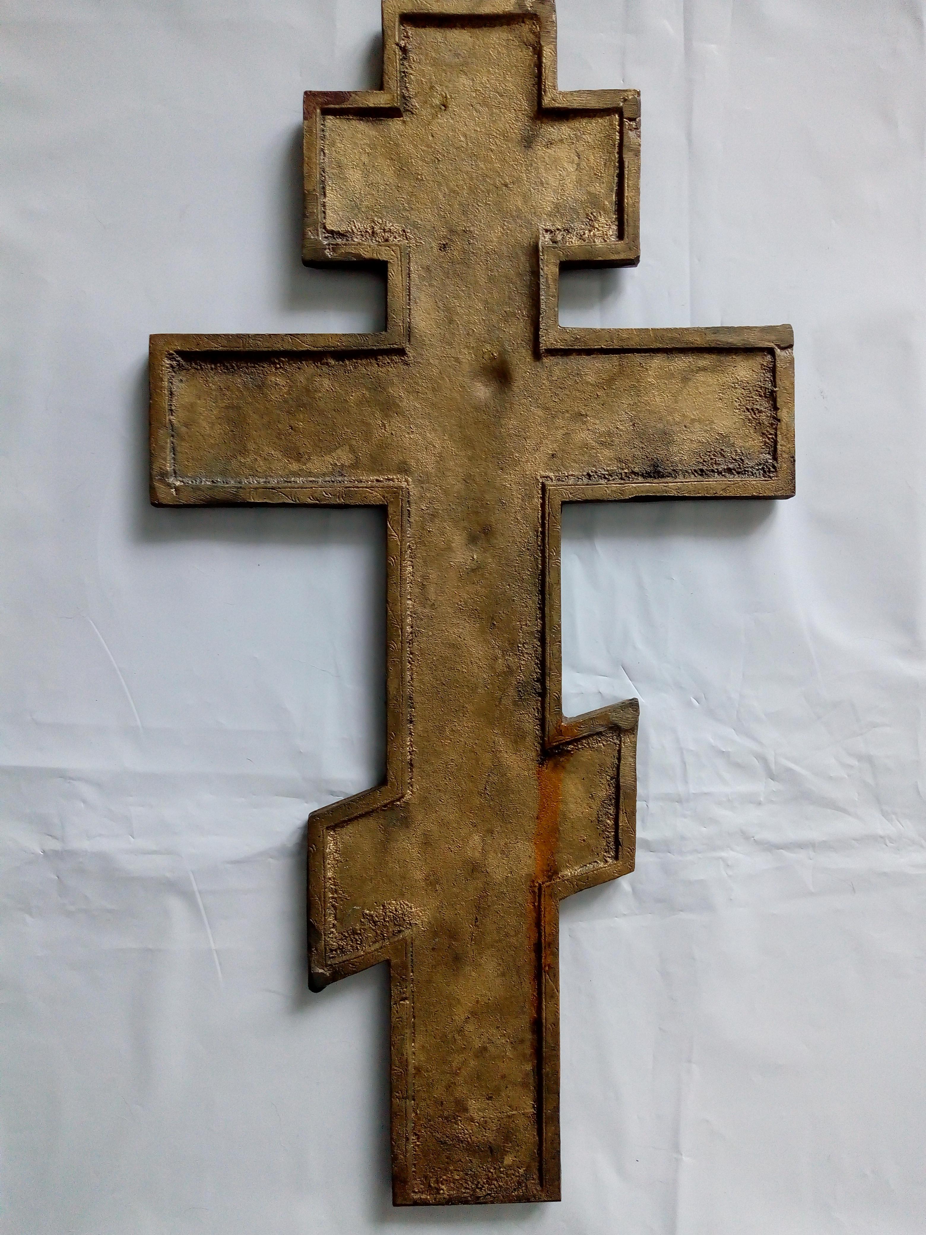 Большой и тяжелый литой крест. Размер 38*20 см. Вес 1215 гр С лицевой стороны покрыт чем то вроде олифы.