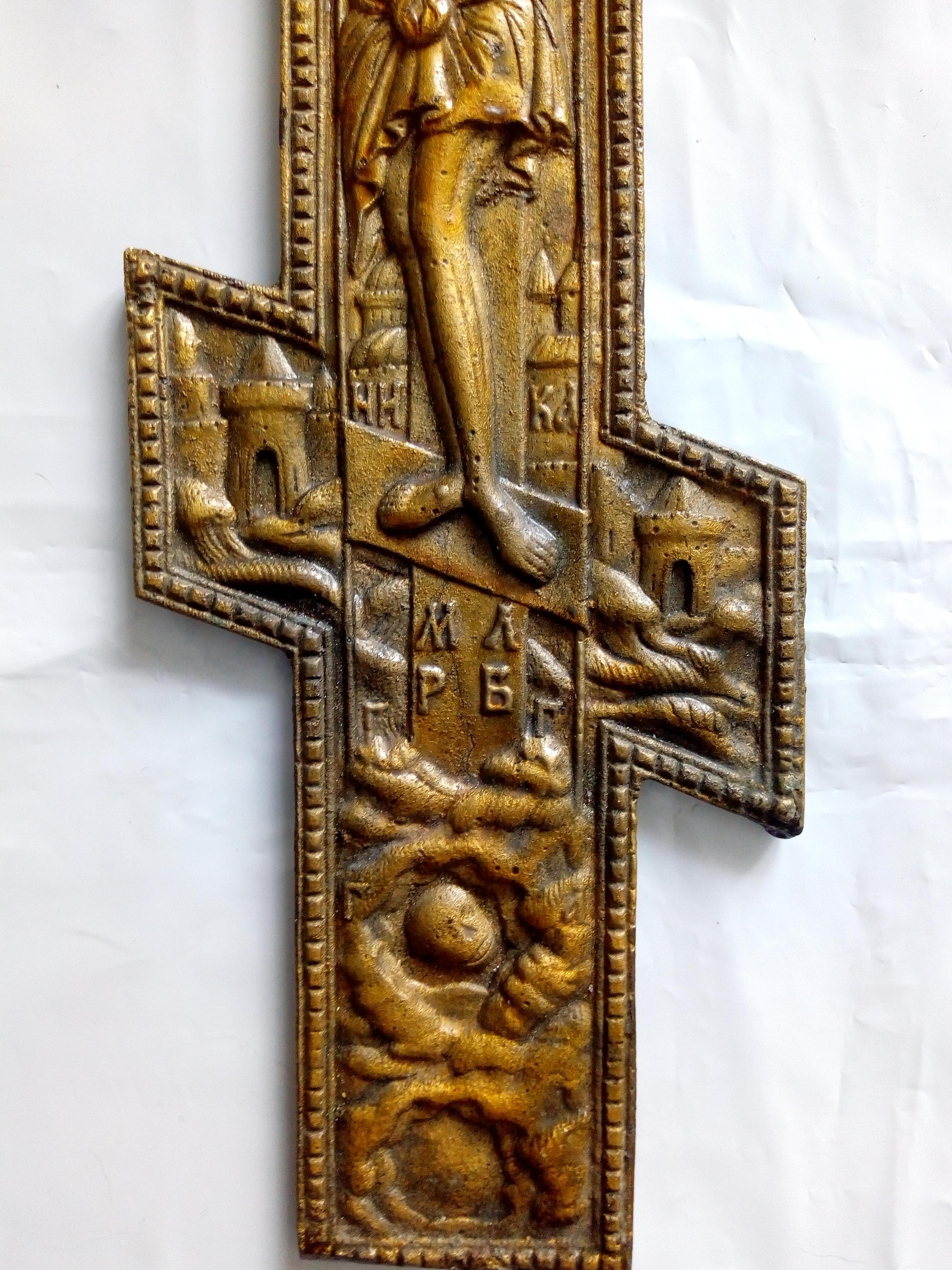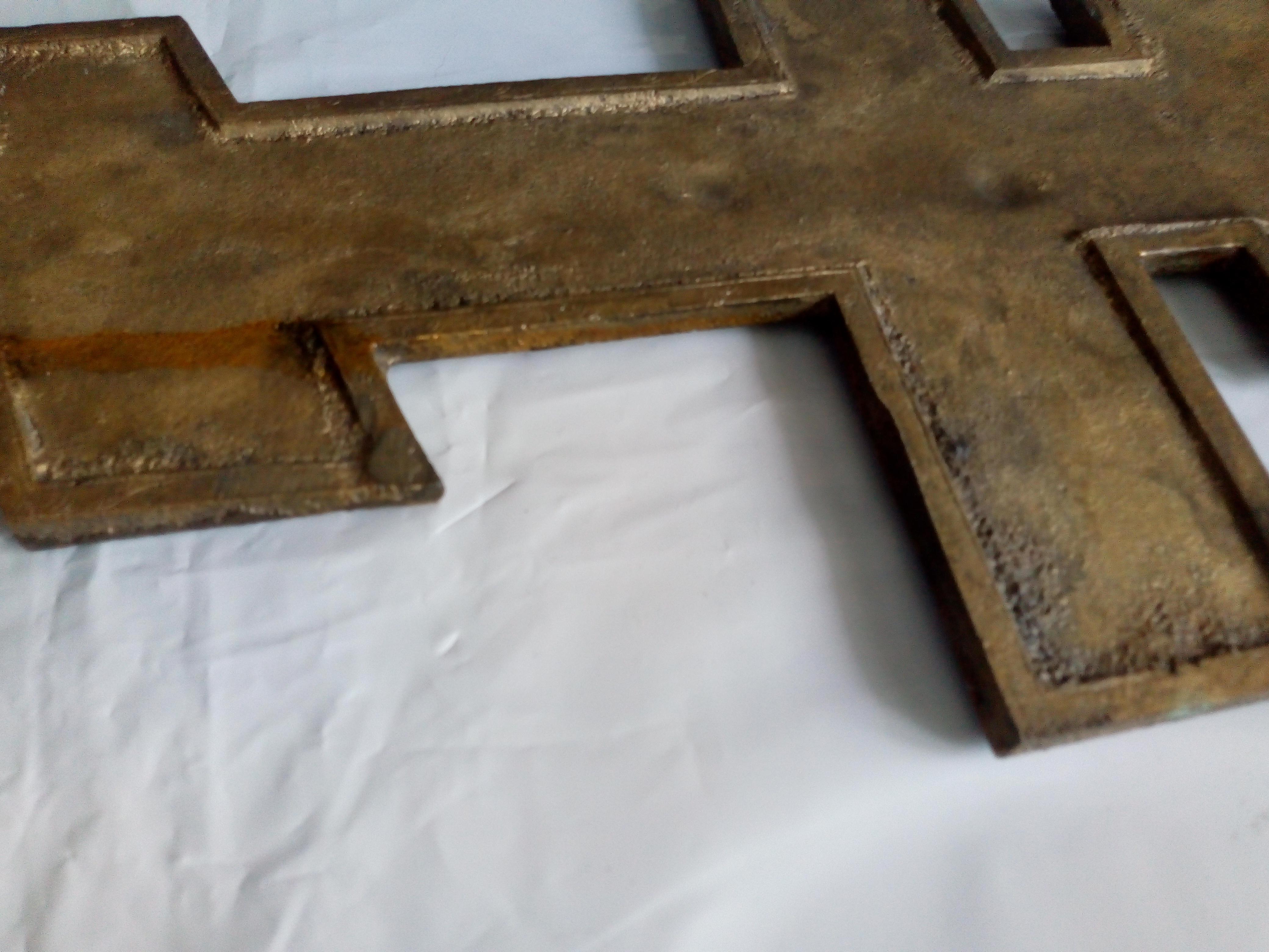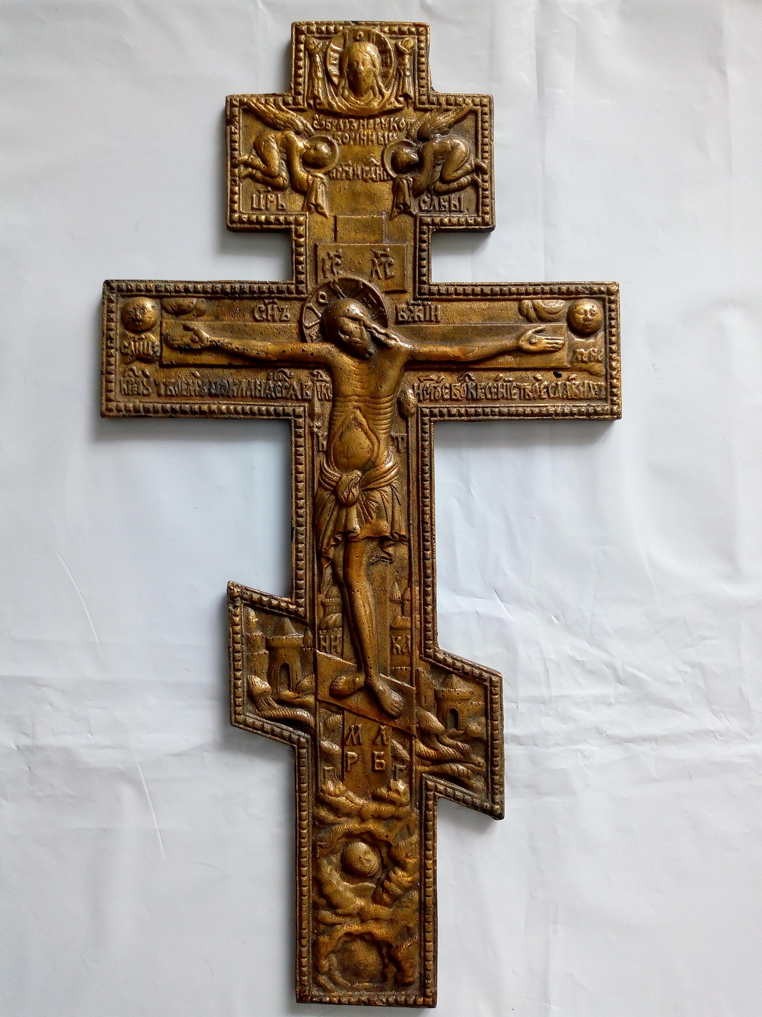 Большой и тяжелый литой крест. Размер 38*20 см. Вес 1215 гр С лицевой стороны покрыт чем то вроде олифы.
