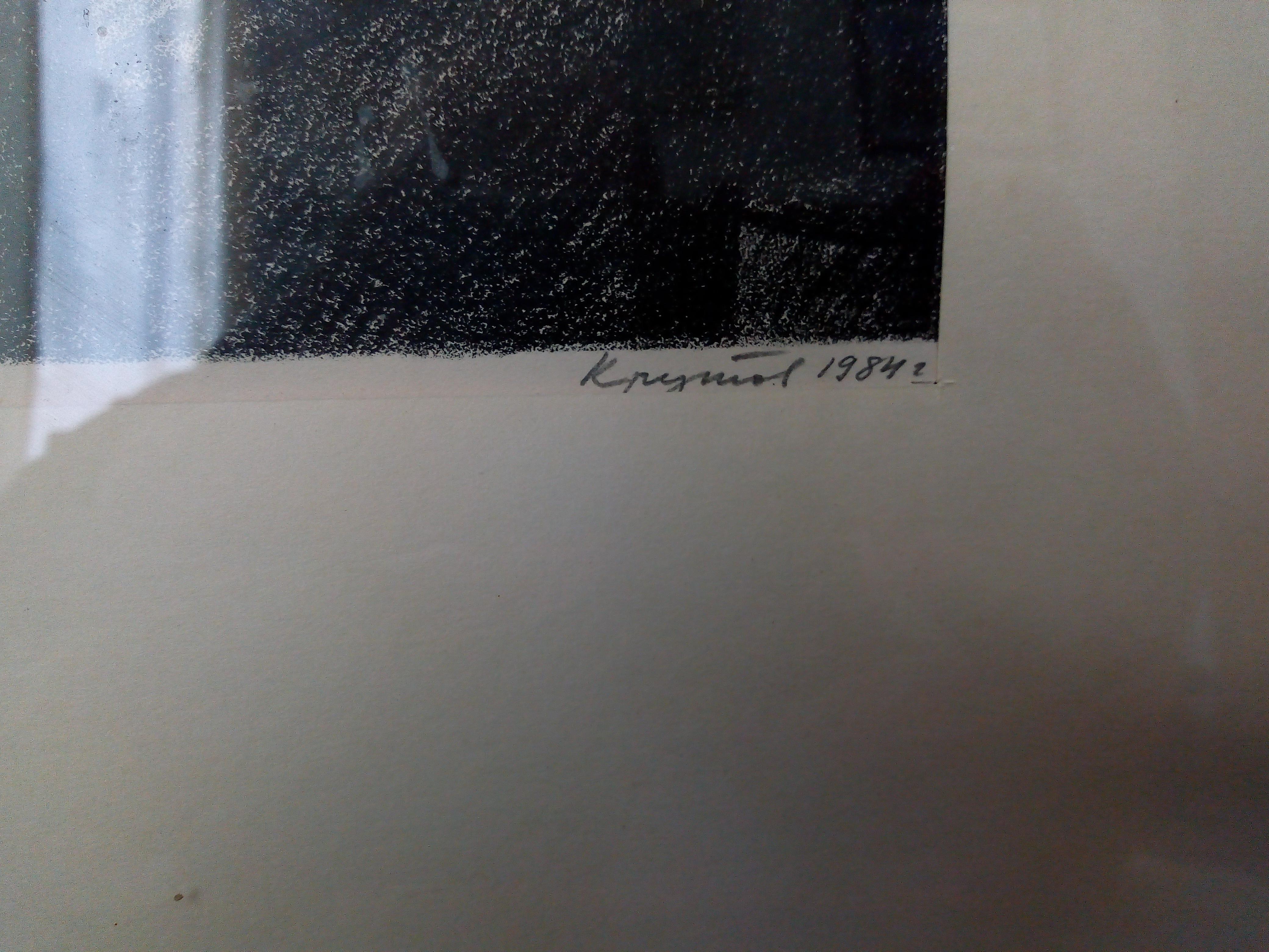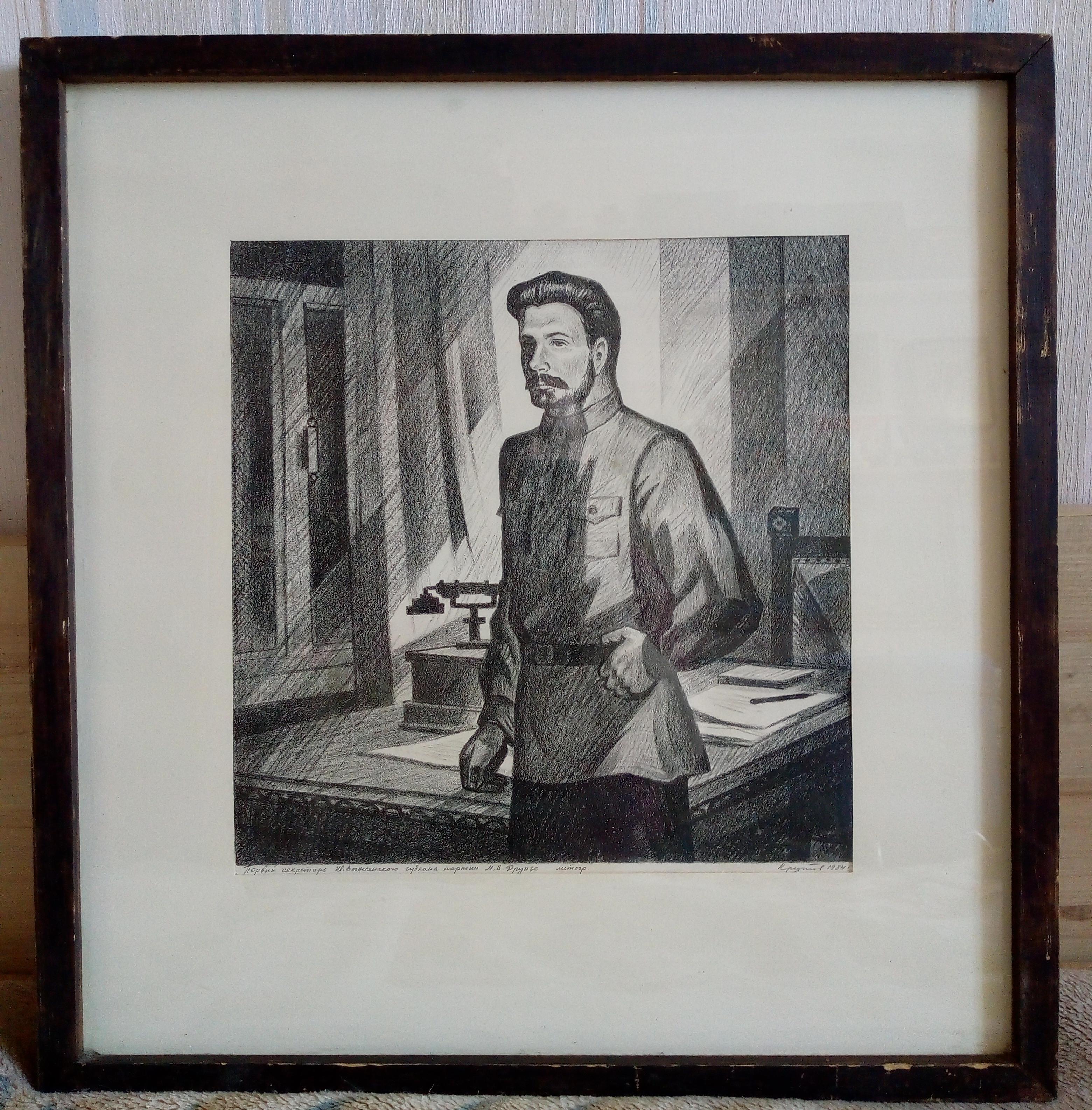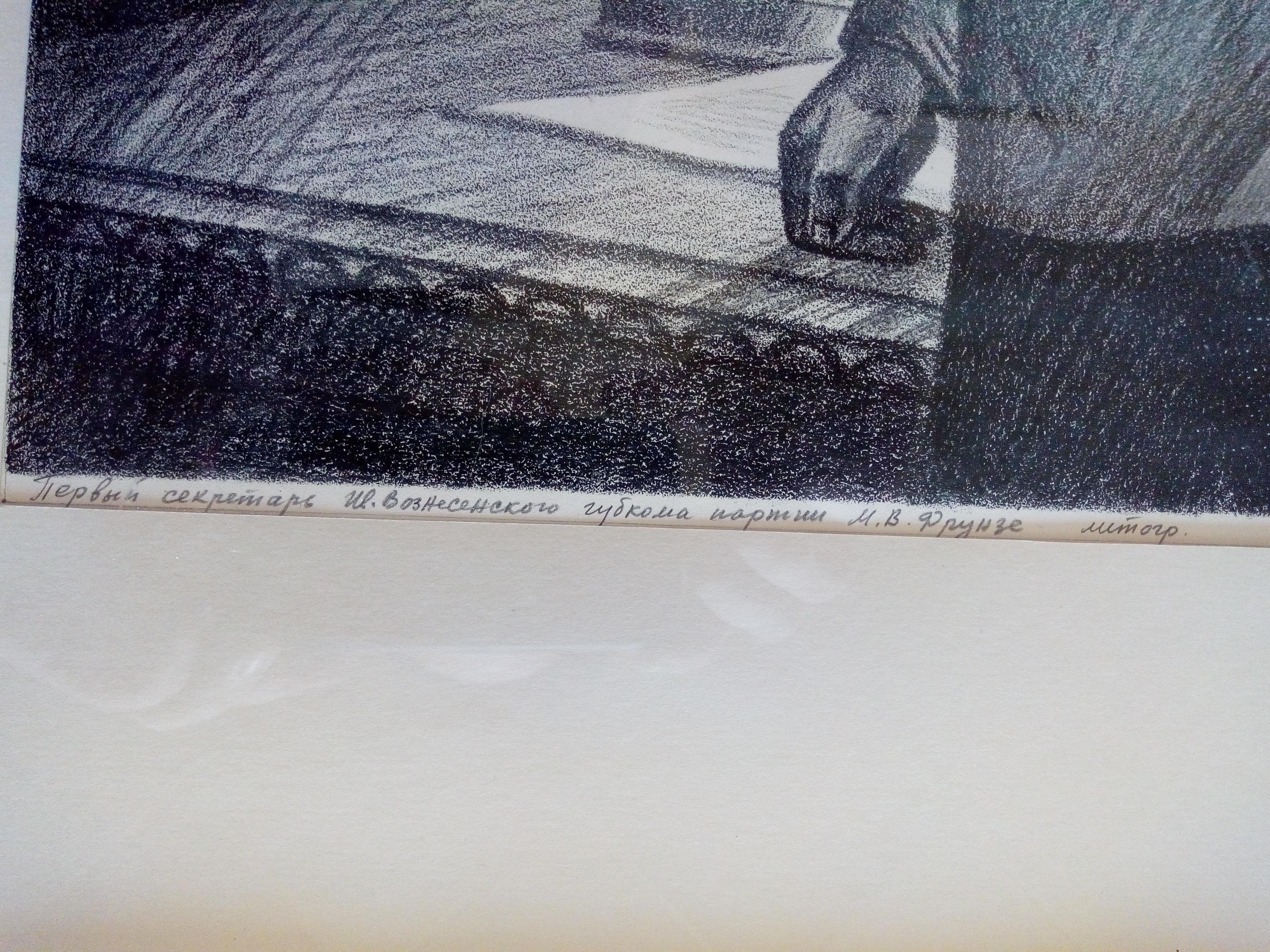 Работа "М.В. Фрунзе" , размер по раме 58*60 см, рама со стеклом. Крутов Валерий Михайлович (1934 - 2010) Родился в городе Иваново в 1934 году. В 1956 - окончил Ивановское художественное училище. В 1965 - окончил Московский полиграфический институт, факультет графики. С 1965 по 1972 - работал ответственным секретарём Ивановской организации Союза художников РСФСР. Сотрудничал с Ивановским, а затем с Верхне-Волжским книжным издательством. С 1965 г. активный участник творческой и выставочной деятельности: участник зональных (межрегиональных), Всероссийских, Республиканских, областных выставок. Произведения находятся в музеях и частных коллекциях России и за рубежом.