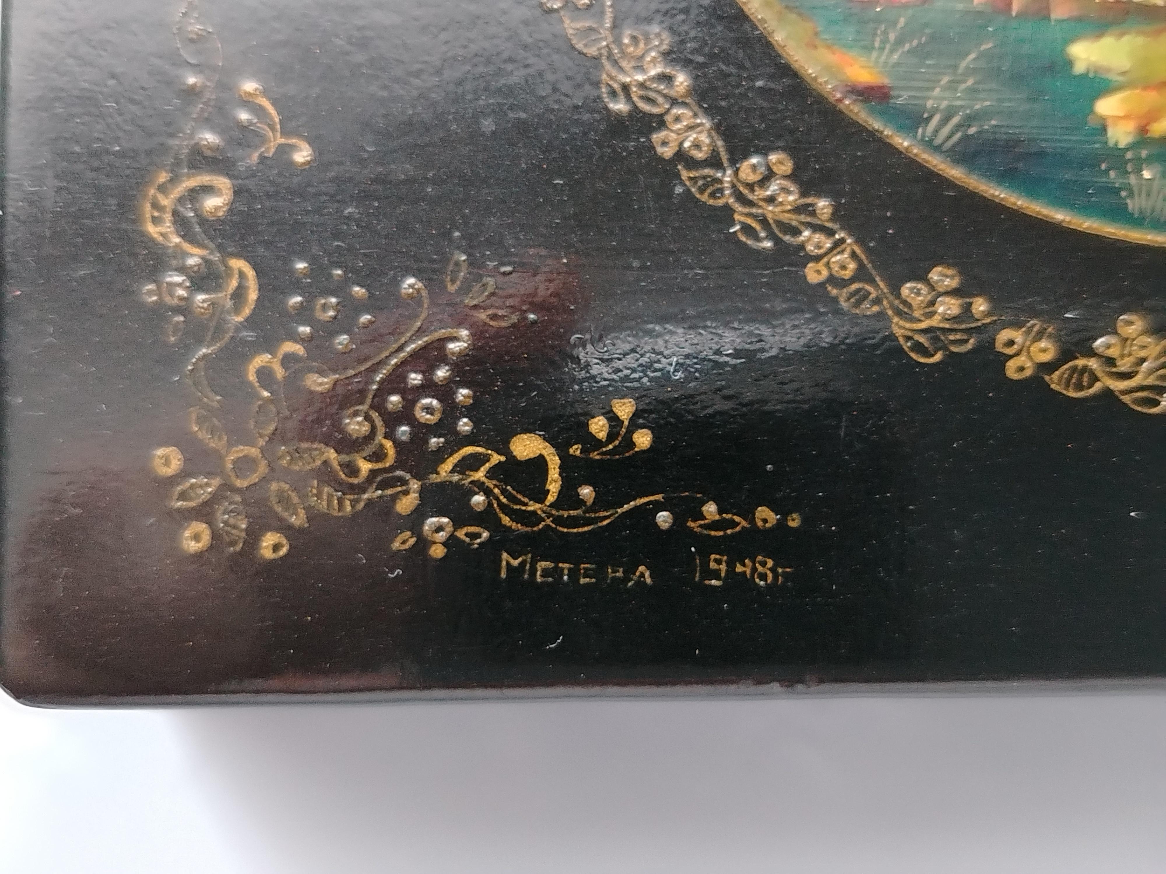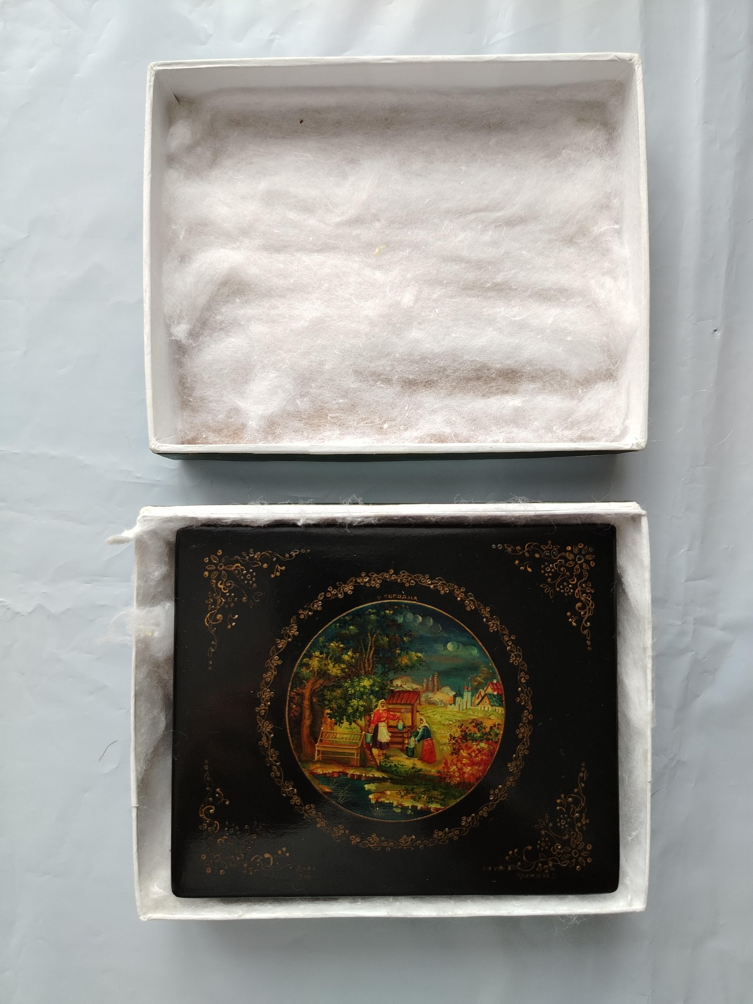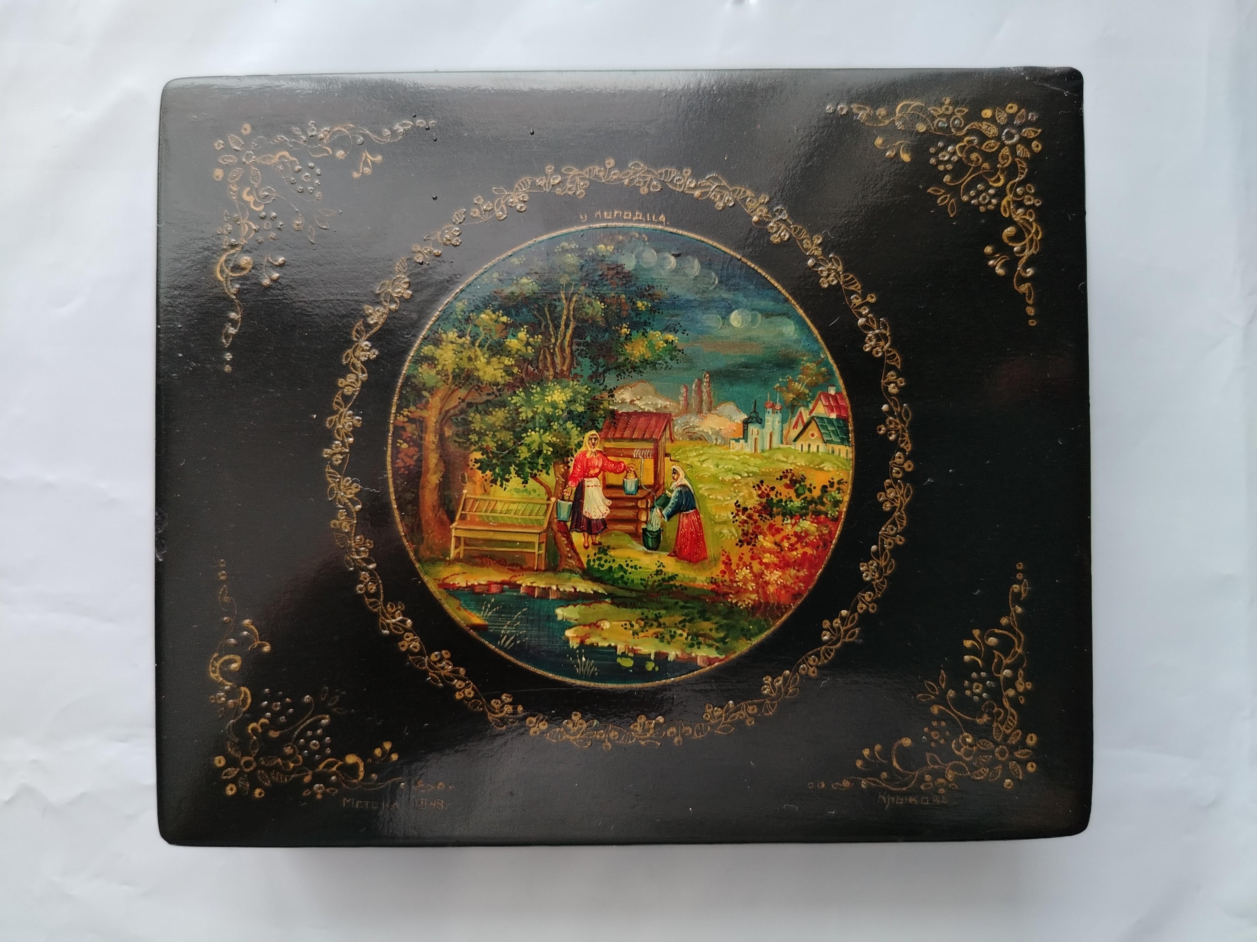 Шкатулка Мстера 1948 г "У колодца,"исполнитель Крыкова Размер 12,5*10*2,5 см