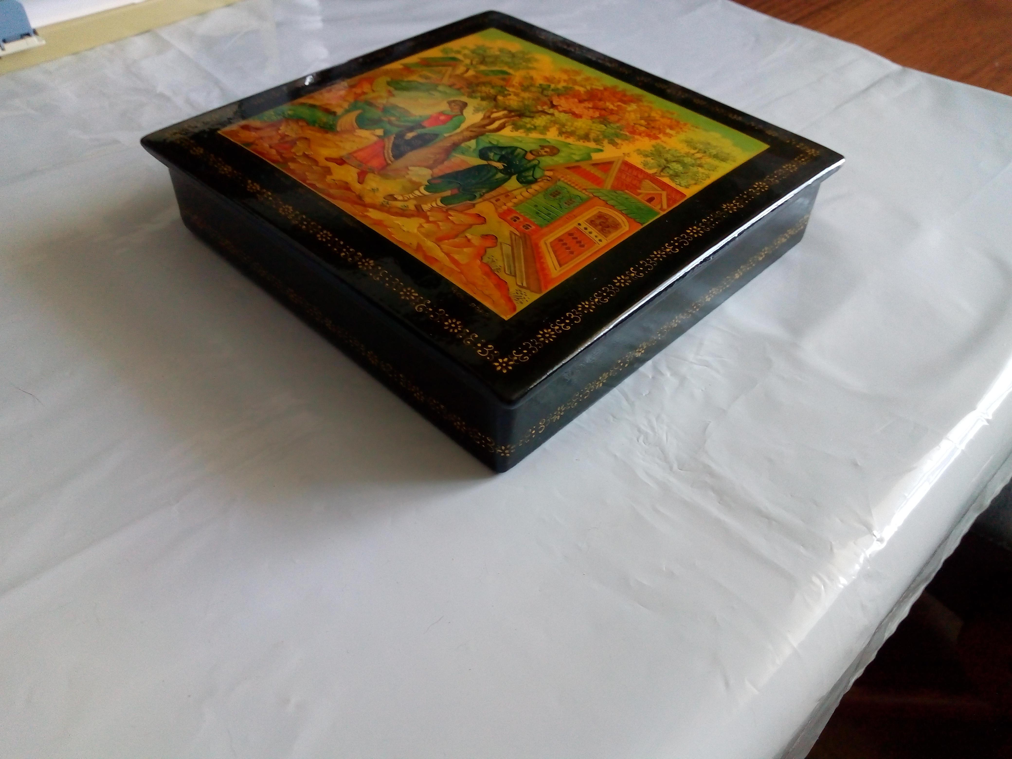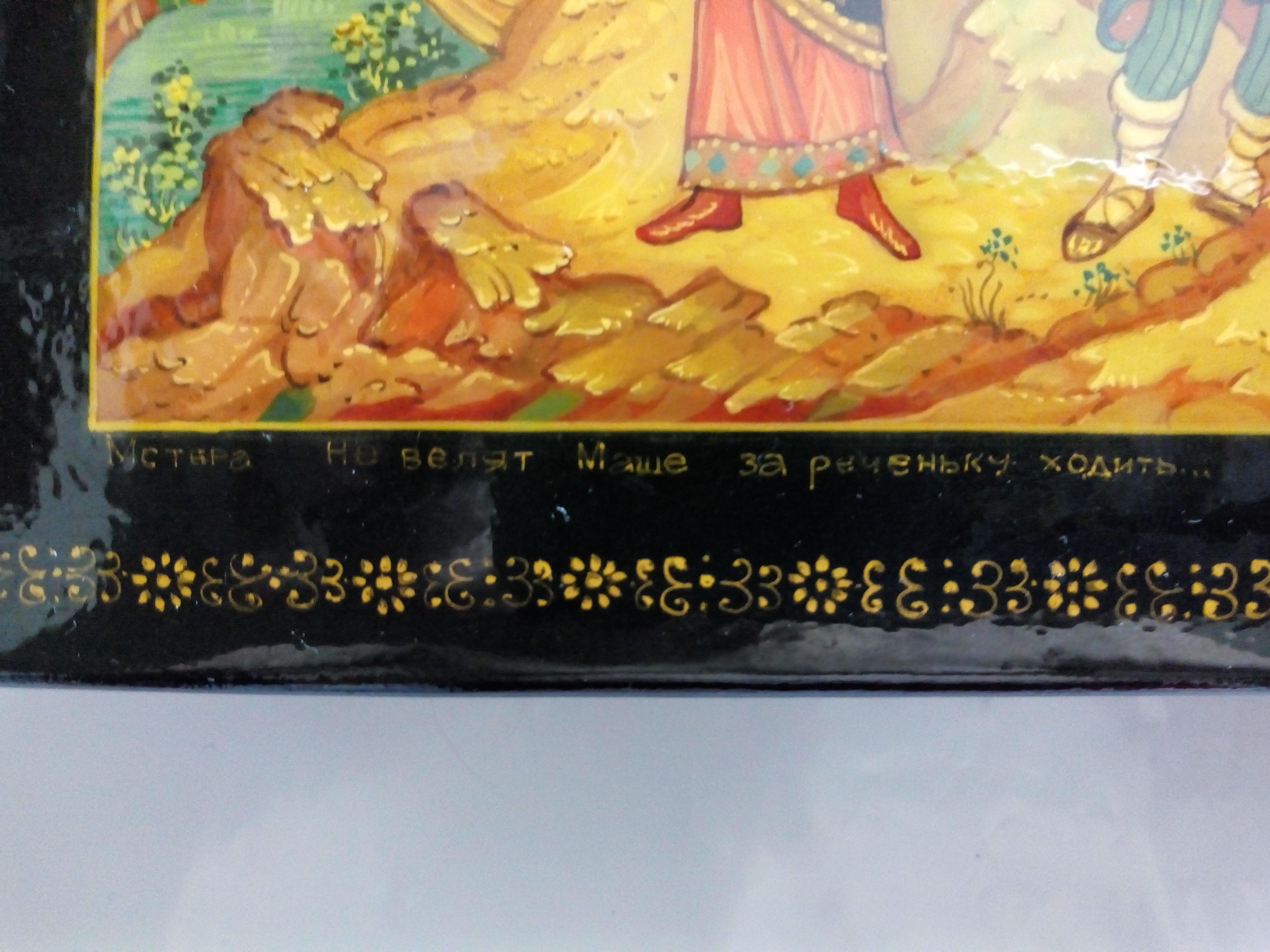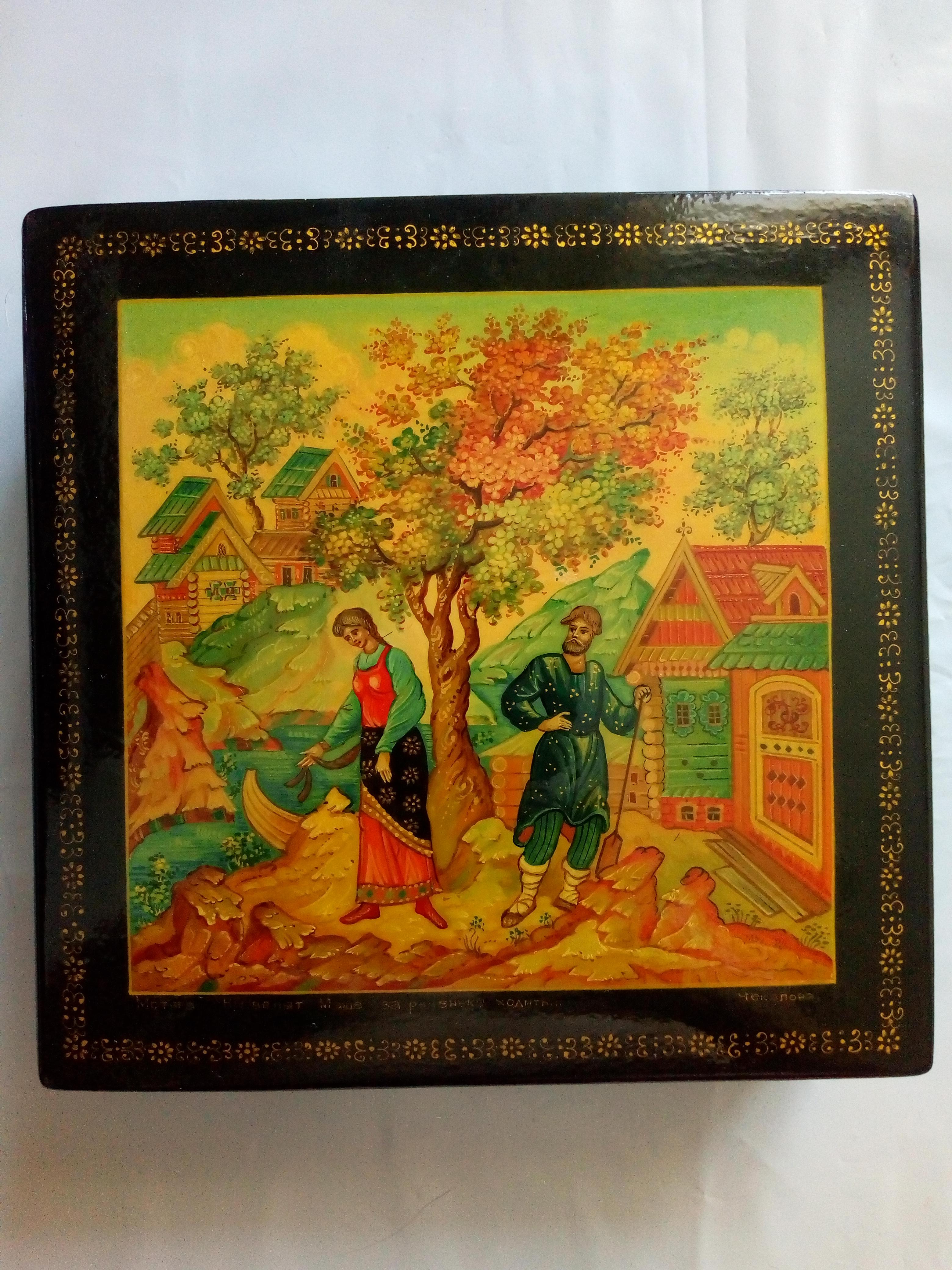 Шкатулка Мстера "Не велят Маше за реченьку ходить...". Размер 16*16*3,5 см. Исполнитель Чекалова.