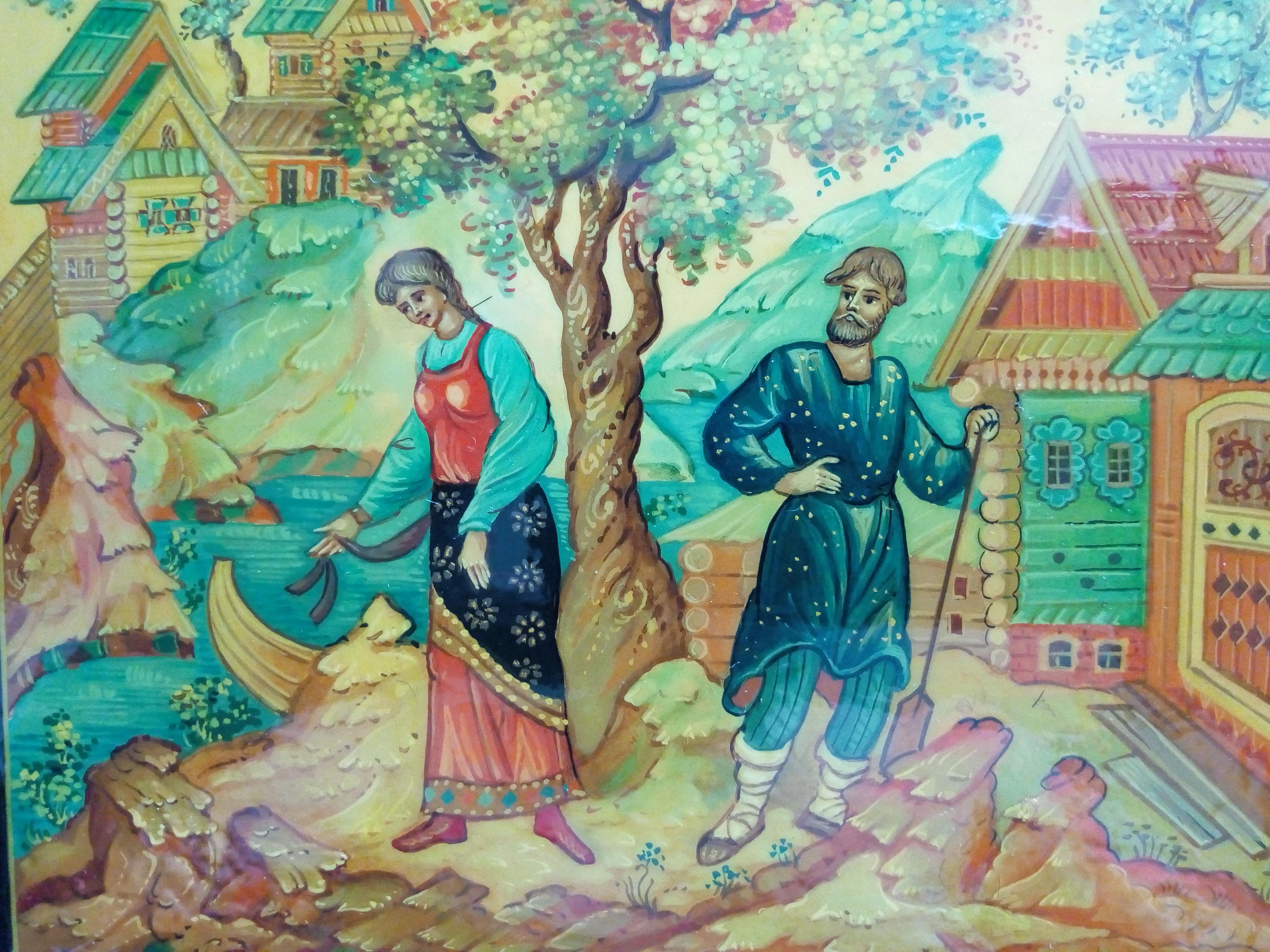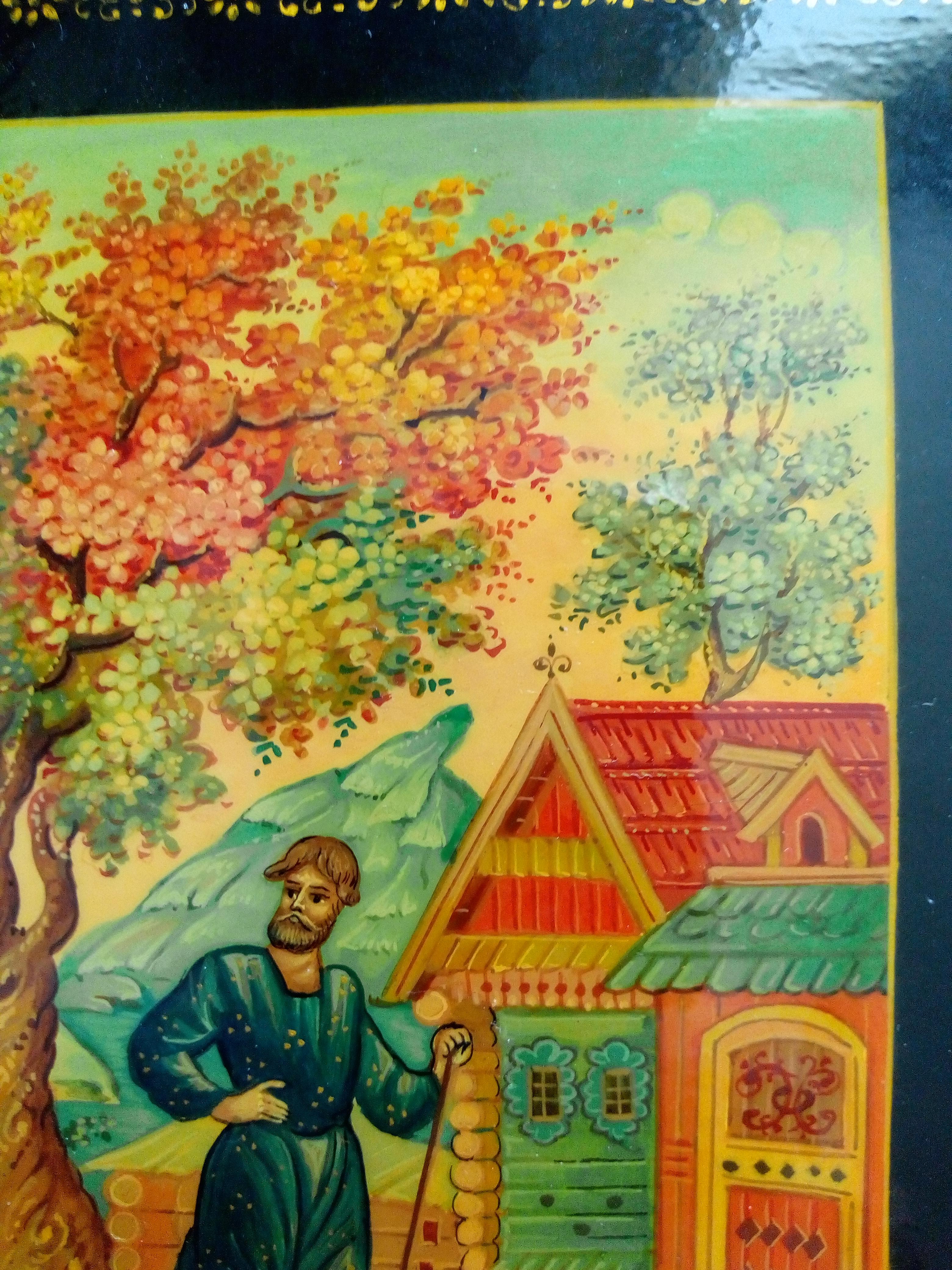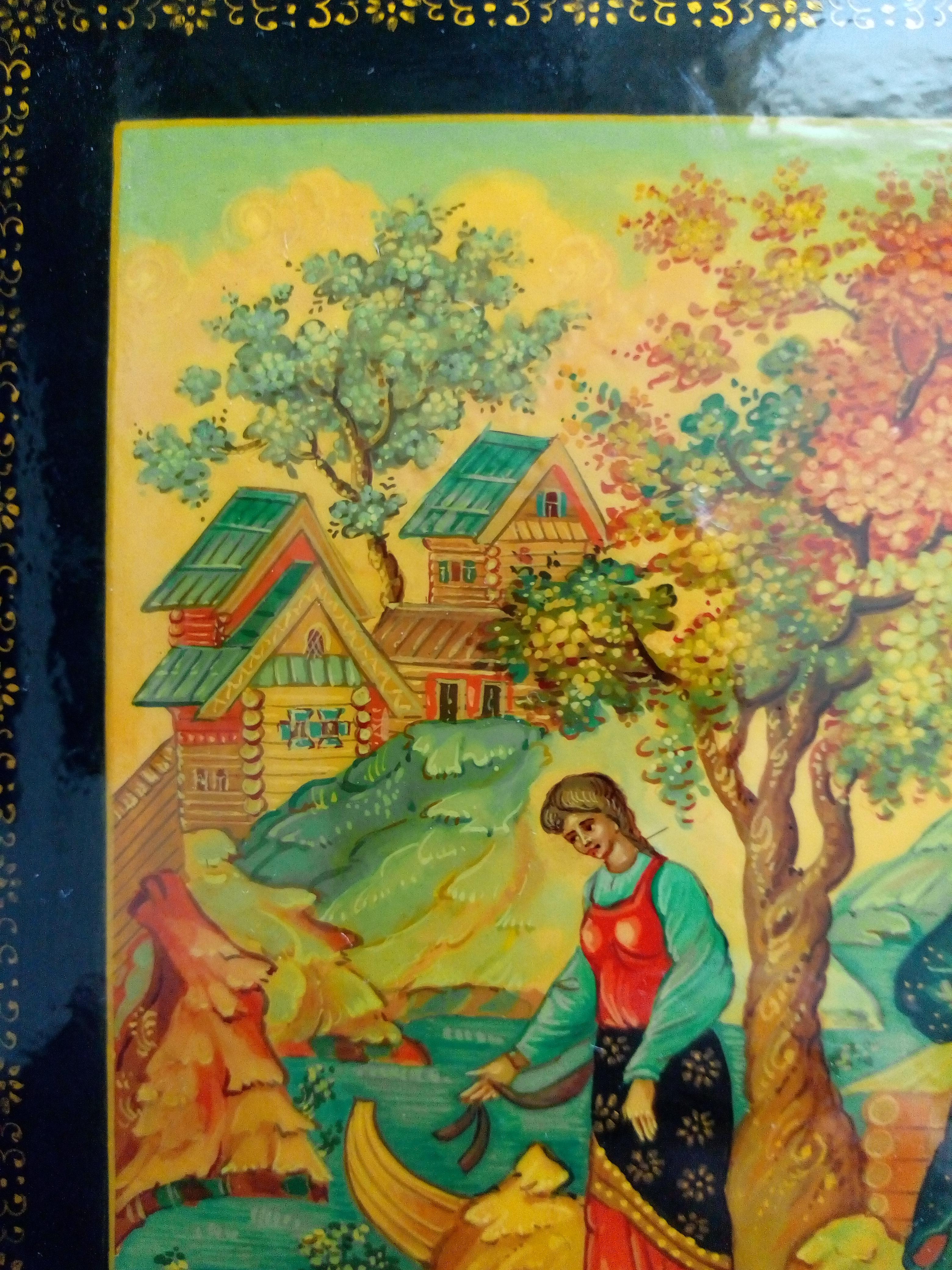 Шкатулка Мстера "Не велят Маше за реченьку ходить...". Размер 16*16*3,5 см. Исполнитель Чекалова.
