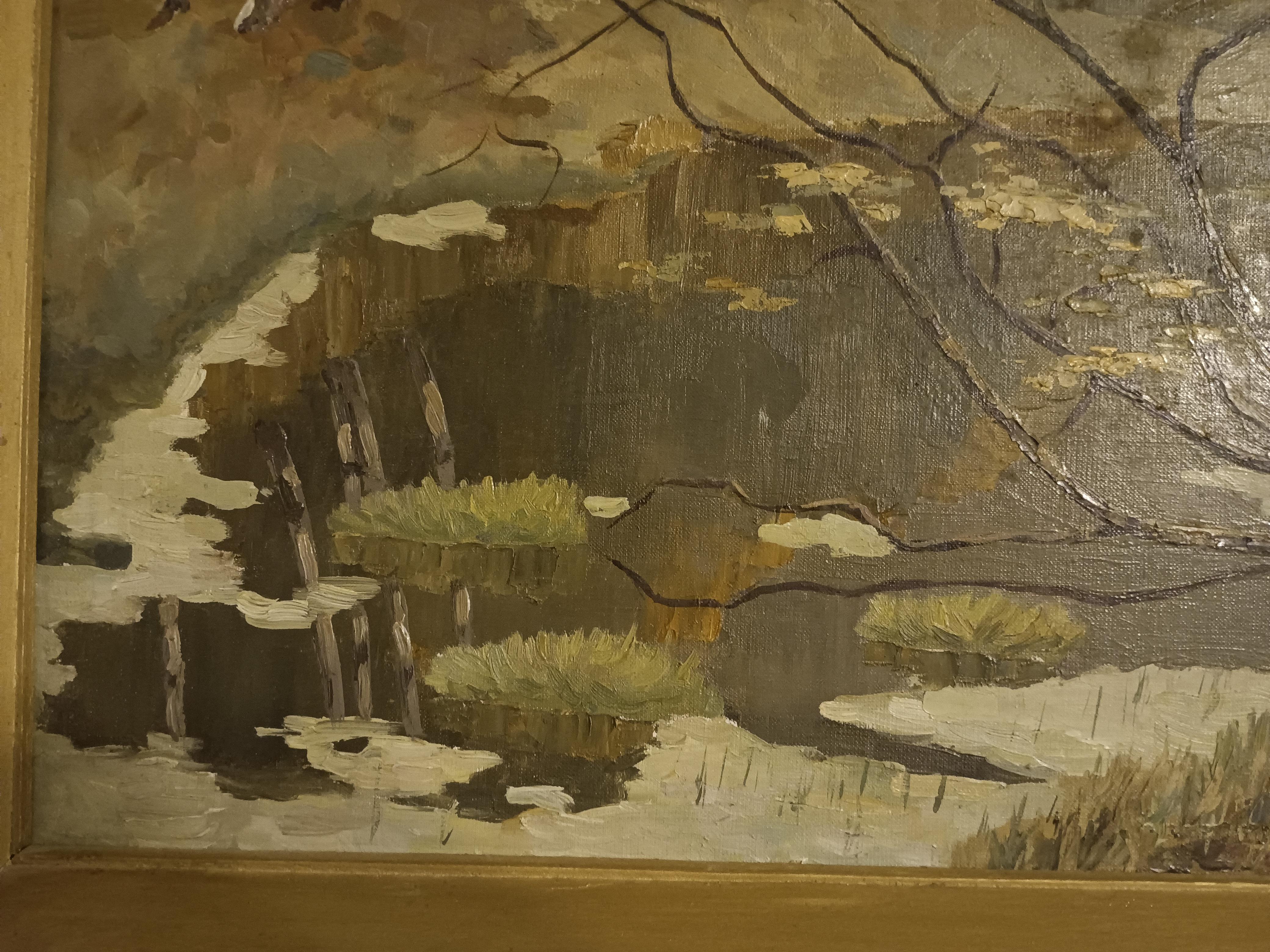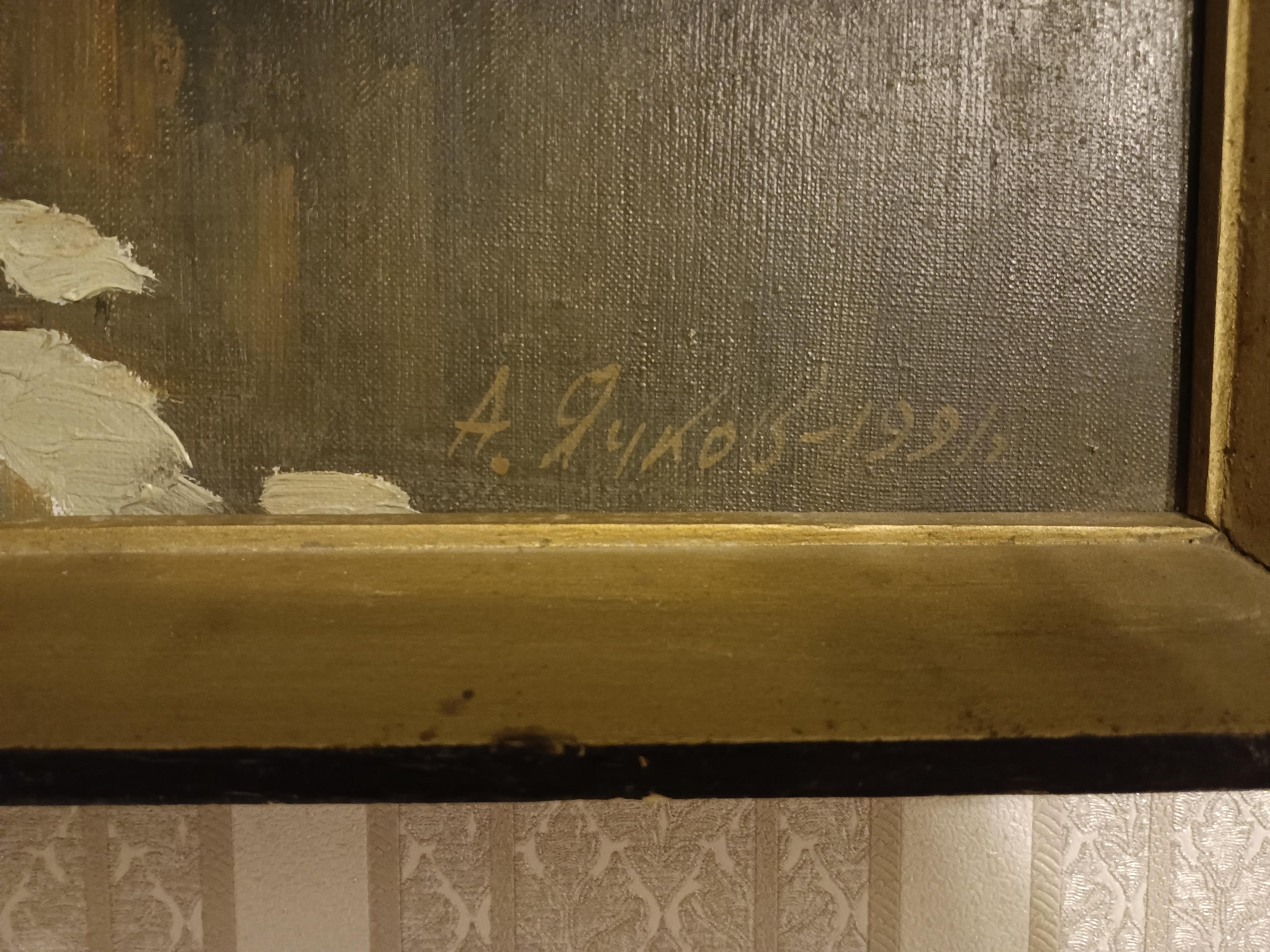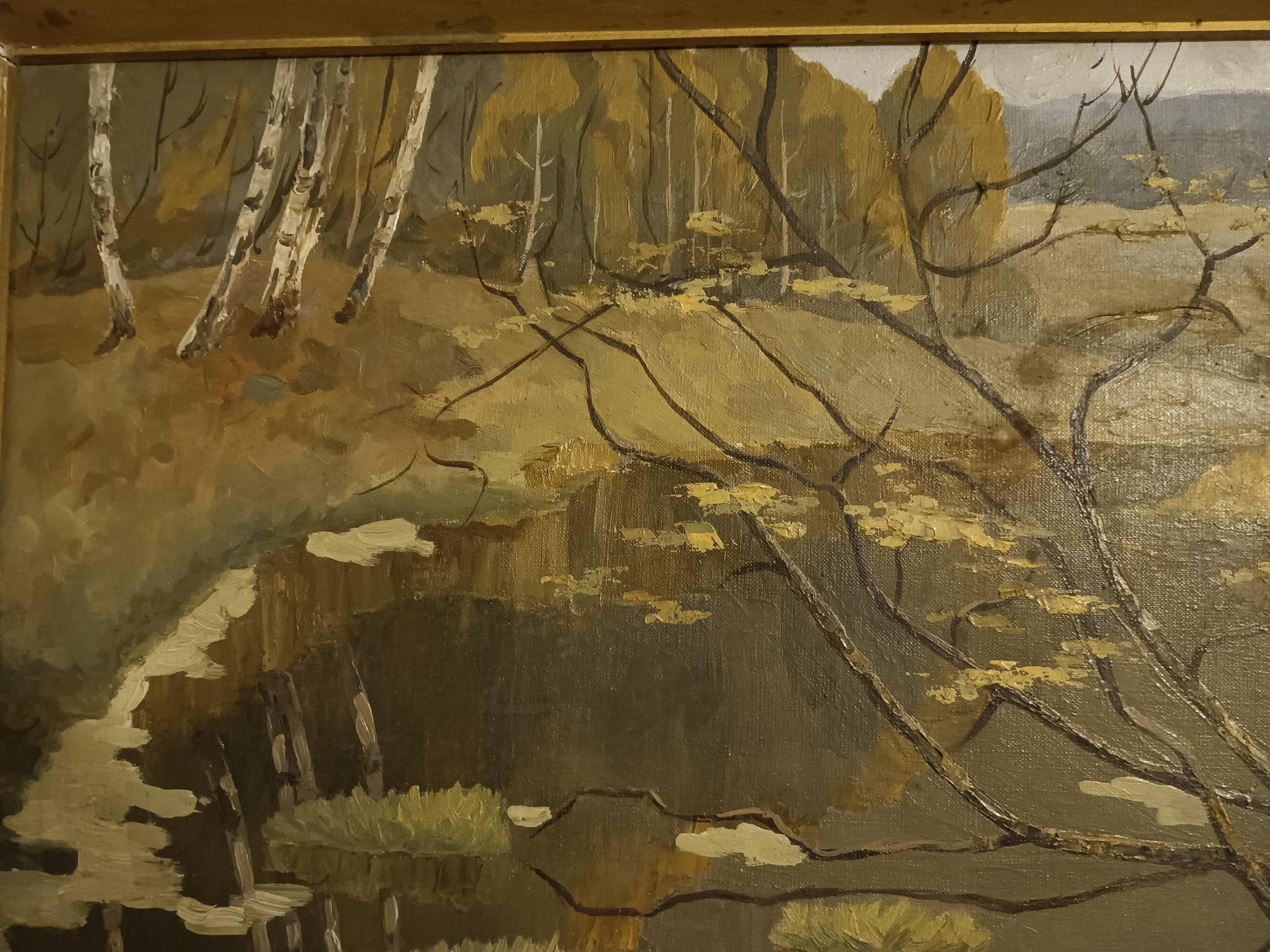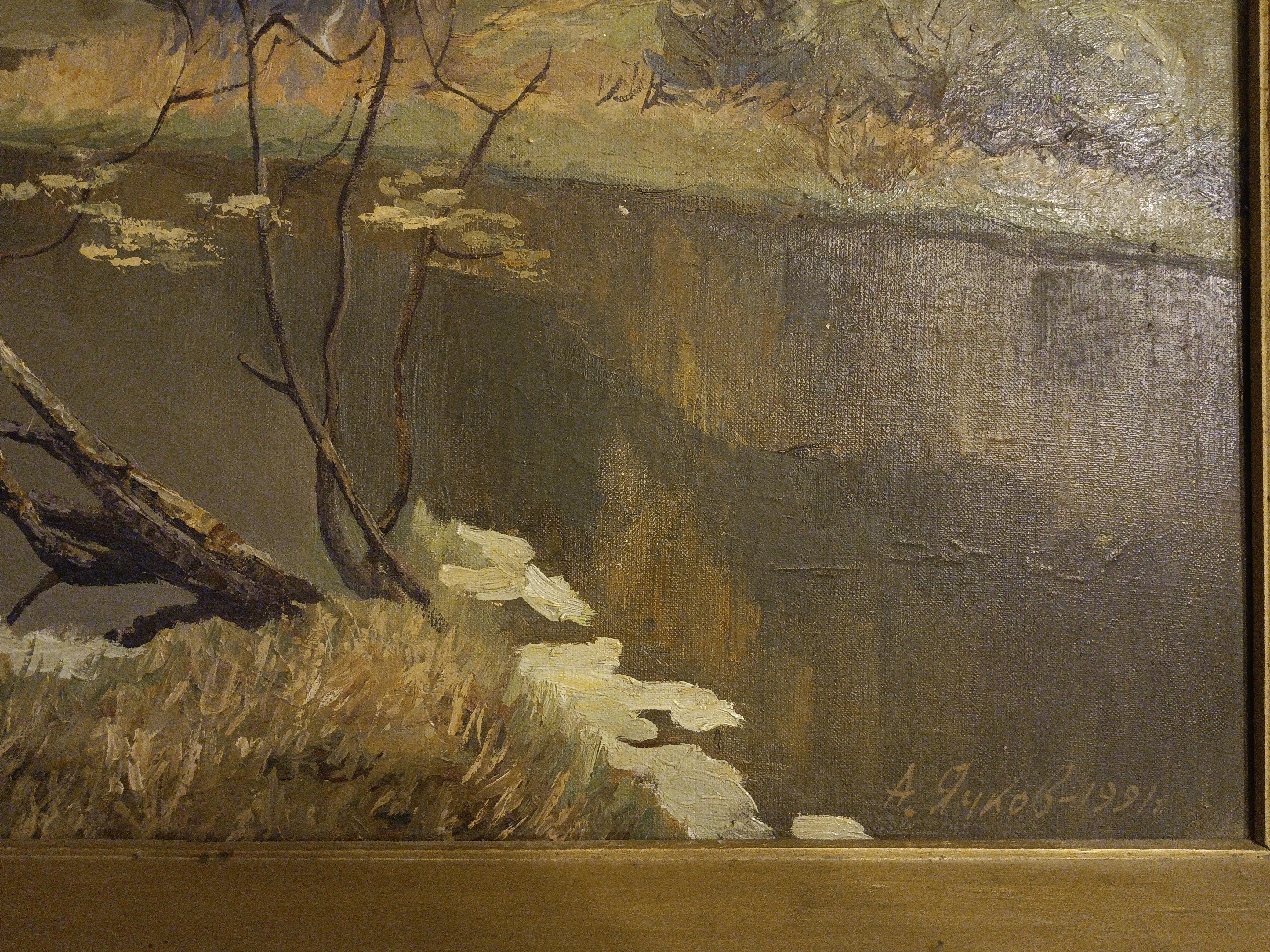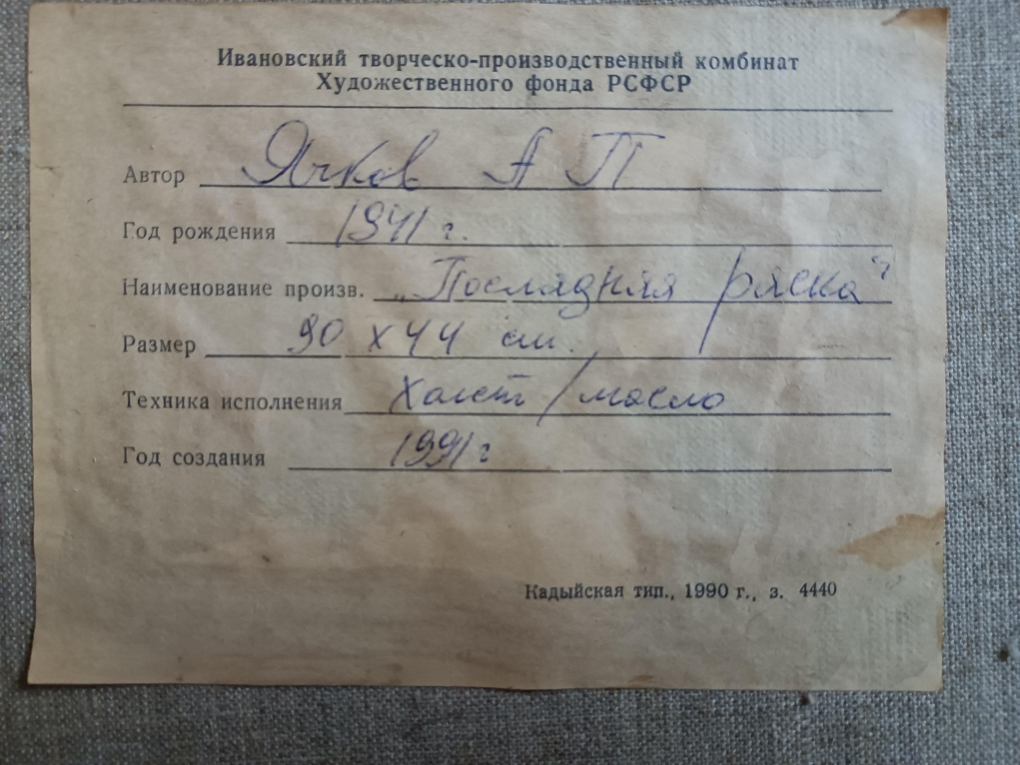 Картина "Последняя ряска". Размер холста 90*44 см, рамы 94*48 см. Ячков Александр Прохорович Ячков Александр Прохорович — живописец, член Союза художников России и международной ассоциации АИАП-ЮНЕСКО. Родился 24 ноября 1941 года в деревне Филино Рязанской области. В 1967 году окончил Ивановское художественное училище. Основное направление в творчестве — станковая живопись, в жанрах натюрморт, пейзаж, портрет. В графике использует пастель, акварель, темперу. Ячков — активный участник межрегиональных, всероссийских, областных и городских выставок. Участвовал в проекте «Художники земли Ивановской» (выставки в Москве, Владимире, Костроме, Орле). Произведения художника находятся в Ивановском областном художественном музее, в Доме-музее им. Б. И. Пророкова, в коллекции Ивановского областного отделения СХР, в частных коллекциях России, Канады, Франции, Англии, Германии и Польши